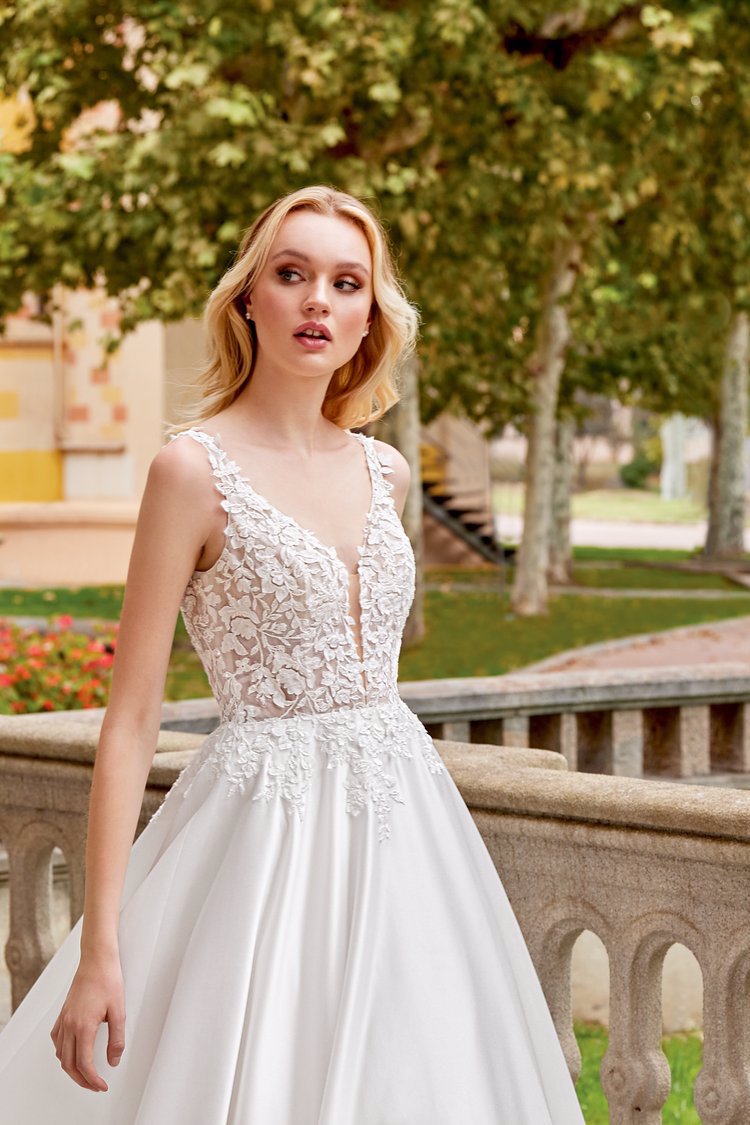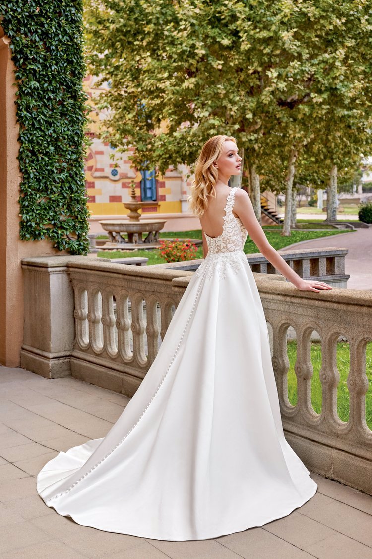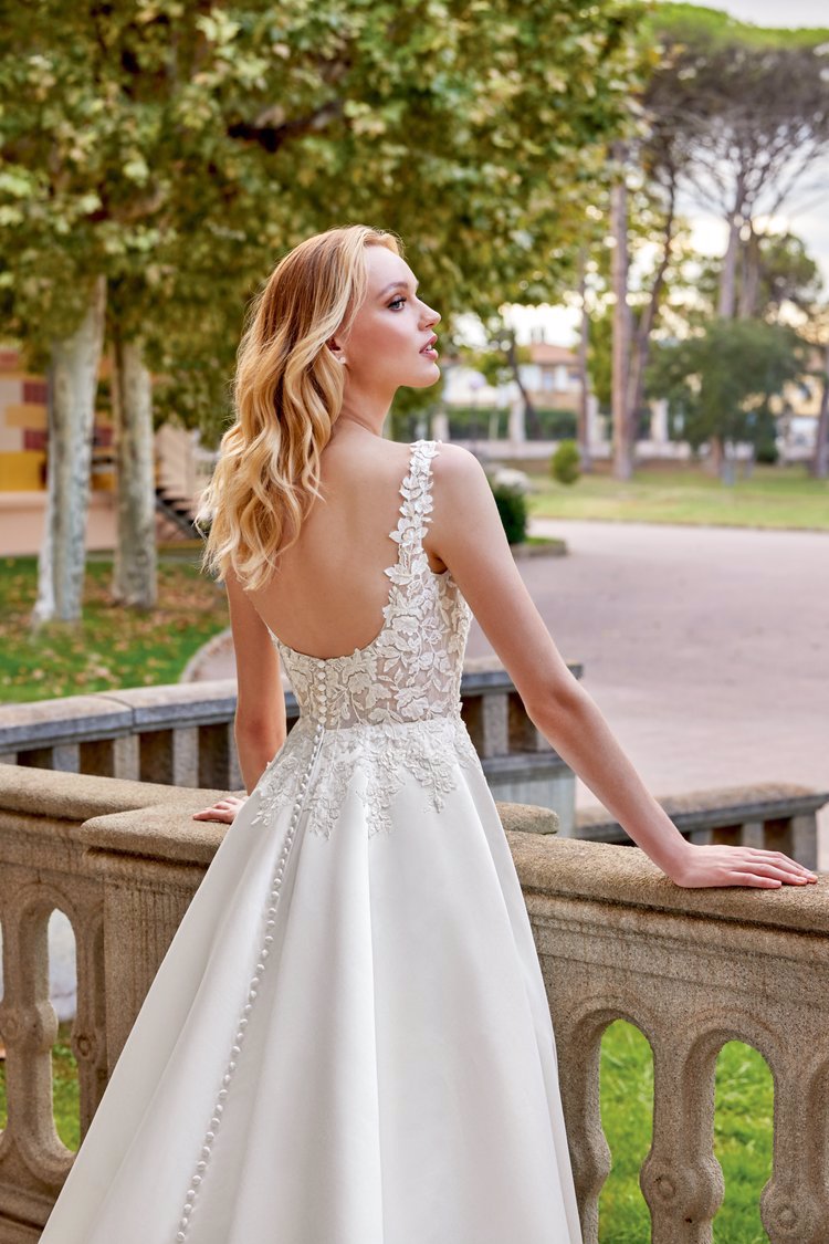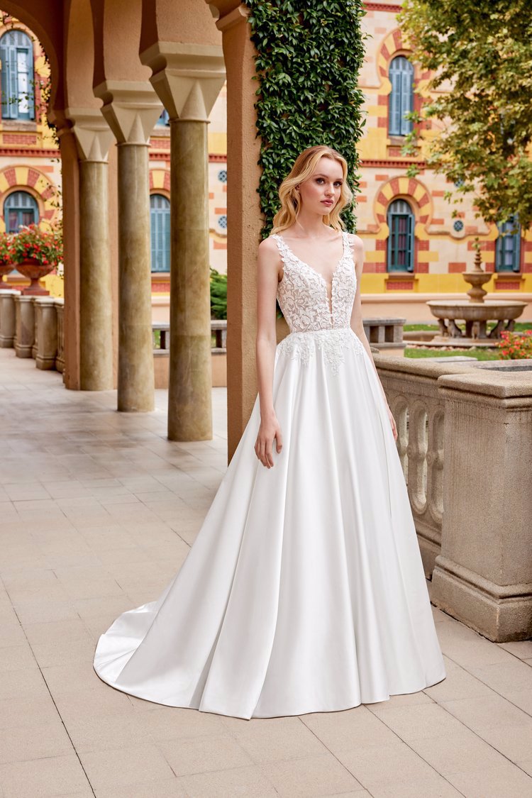 Een satijnen A-lijn jurk met een transparant lijfje voorzien van een diepe V-hals en vierkante lijn in de rug. Het lijfje is versierd met pailletten, kant en 3D bloemetjes. Compleet met zakken en satijnen knoopjes langs de achterzijde die doorlopen tot het uiteinde van de sleep.