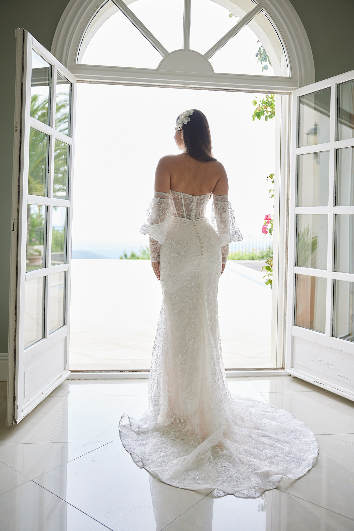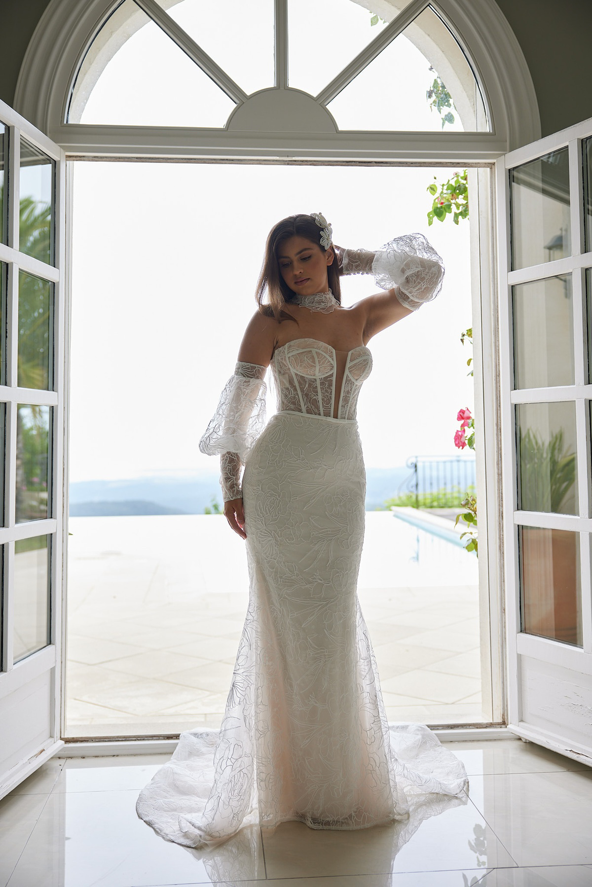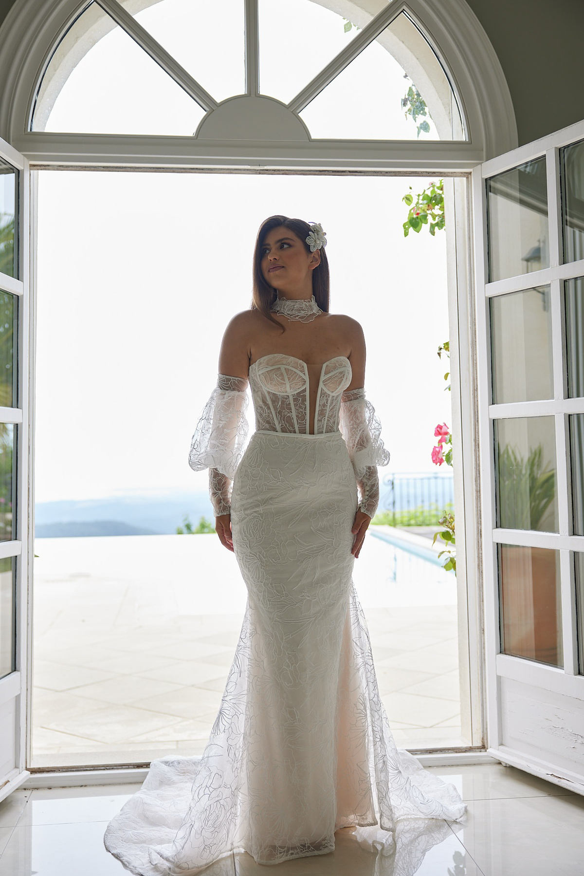 Een mega sexy romantische jurk met een strapless sweetheart halslijn en een uniek design. Deze jurk straalt elegantie en klasse uit. De optionele mouwen voegen een extra vleugje speelsheid toe aan deze unieke creatie.