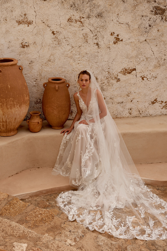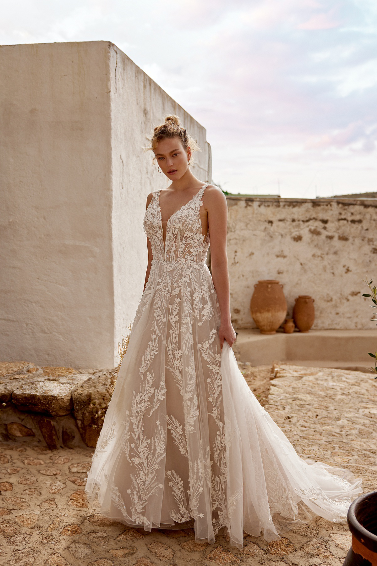 Tule A-lijn jurk met een diepe V-halslijn met een mesh inzetstuk en bandjes. De gehele jurk inclusief de sleep is versierd met kanten borduursels met pailletten en kraaltjes. Verder zitten 3D bladapplicaties verspreid over het kantborduursel. Voorzien van een doorschijnend lijfje met zichtbare baleinen en mesh V-zijkanten. De diepe V-rug bevat knopen tot het einde van de rits. Deze jurk is ook verkrijgbaar met een volledig gevoerd lijfje.