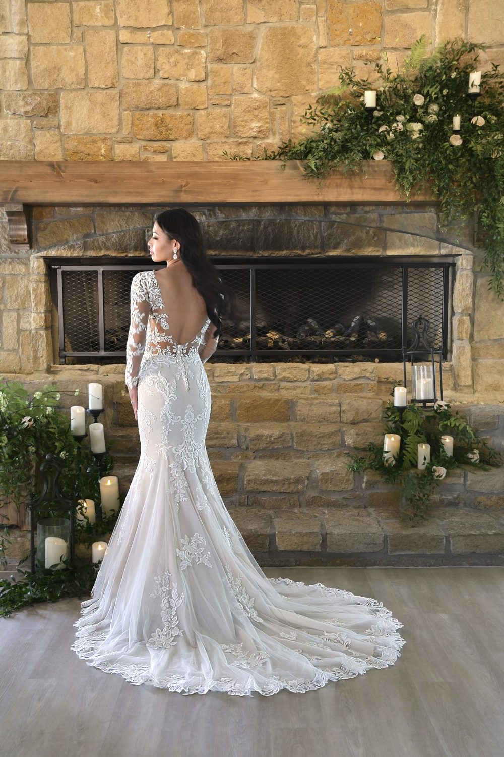 Op zoek naar een klassieke bruidsjurk met een sexy twist? Deze trouwjurk van Stella York is de perfecte jurk voor jou! De diepe V-halslijn en het fit-and-flare silhouet zijn klassiek bruids, met doorschijnende zijuitsnijdingen en een gedurfde open rug die een chique, moderne touch toevoegt. De lange mouwen zijn gemaakt van illusion tule en heeft ingewikkelde kantpatronen, waardoor het lijkt alsof het kant moeiteloos op de huid ligt. De met stof beklede knopen aan de manchetten voegen een prachtig detail toe aan deze toch al prachtige jurk. De rok omsluit de prachtige rondingen van het lichaam en loopt wijd uit onder de heupen, met een volle sleep die zowel elegant als romantisch is. Je voelt je als een prinses die door het gangpad loopt in deze prachtige jurk! Voor jouw bruiloft in een mooie tuin, kas, bos of kasteel!