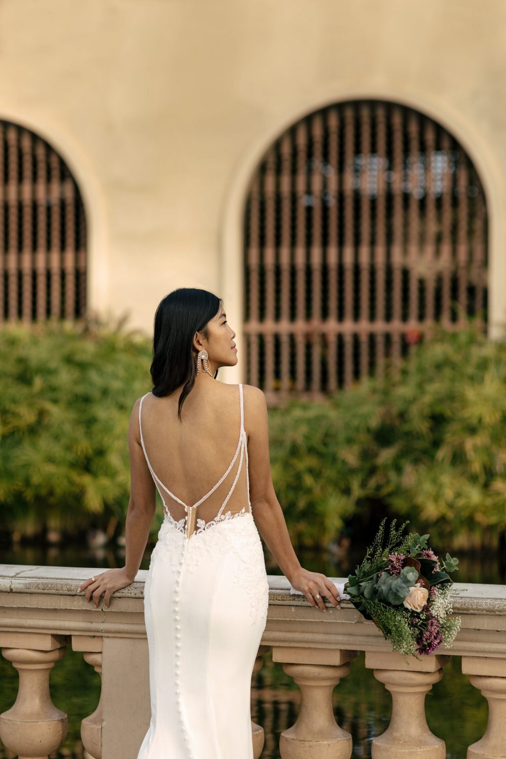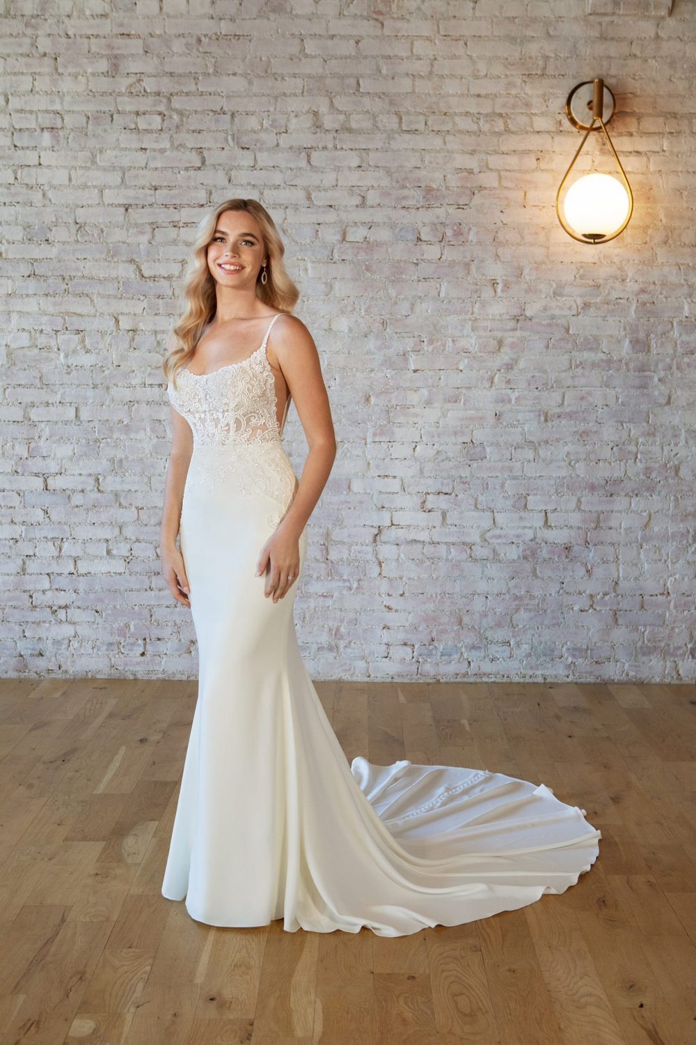 Je trouwdag is een van de belangrijkste dagen van je leven, dus je wilt er op je best uitzien en je op je best voelen. Stella York heeft deze prachtige jurk ontworpen om je er op je grote dag uit te laten zien als een prinses. Het slanke silhouet is flatterend en de spaghettibandjes met kralen voegen een vleugje minimalisme en elegantie toe. Het lijfje met lovertjes en bloemen kanten applicaties accentueert je rondingen en de illusie open rug ziet er geweldig uit. De zachte crêpe stof zweeft over je lichaam voor een sexy allure. Met deze jurk zal je zeker in het middelpunt van de belangstelling staan op jouw bruiloft op het strand, kasteel, tuin of bos.