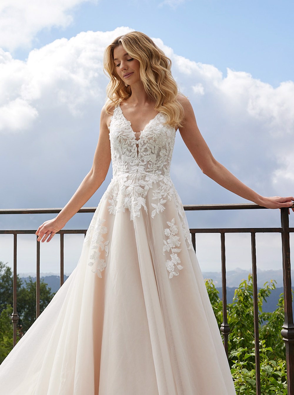 We zijn helemaal weg van dit ontwerp, met een betoverend lijfje versierd met delicate bloemen, kanten borduursels en fijne bandjes, voor een koninklijke uitstraling. De etherische combinatie van tule en kant in de rok creëert een speels silhouet dat soepel zweeft bij elke beweging.Deze romantische trouwjurk kleedt ook heel mooi voor een maatje meer.