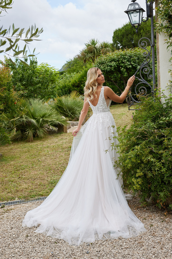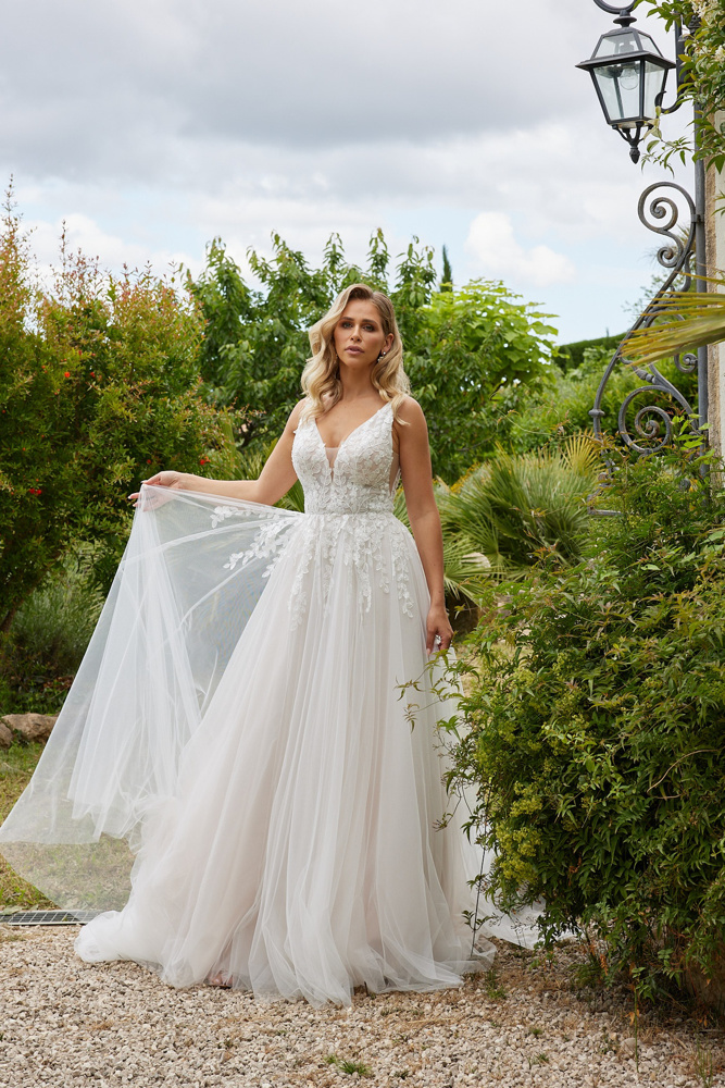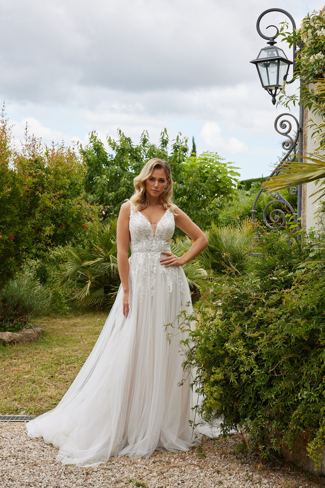 Deze adembenemende soepel vallend jurk van Diane Legrand is perfect voor de romantische bruid. Het kanten lijfje dat naadloos overloopt in de tule rok zorgt voor een dromerige uitstraling. Deze perfecte combinatie van elegantie en speelsheid staat ook heel mooi bij een curvy body.
