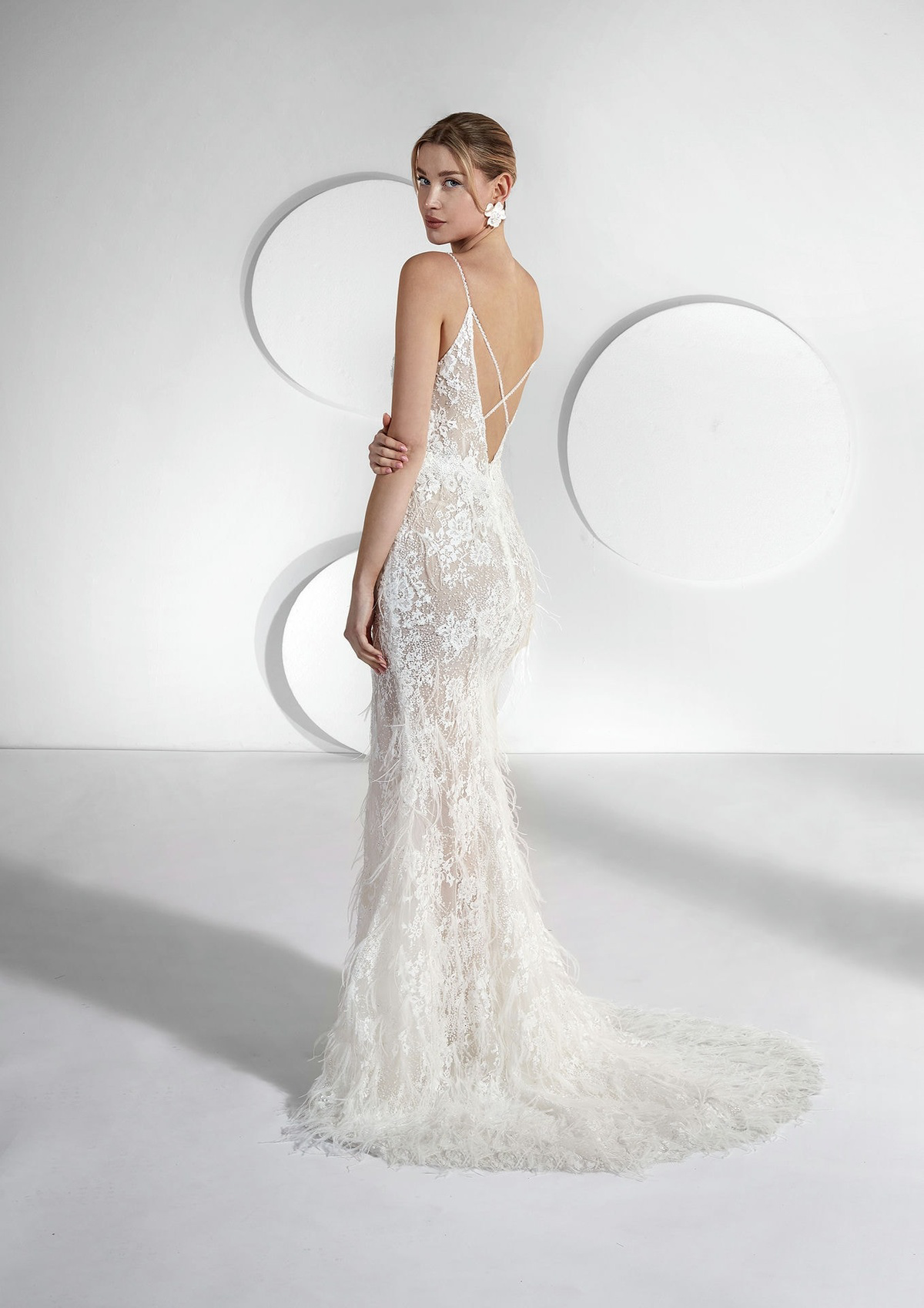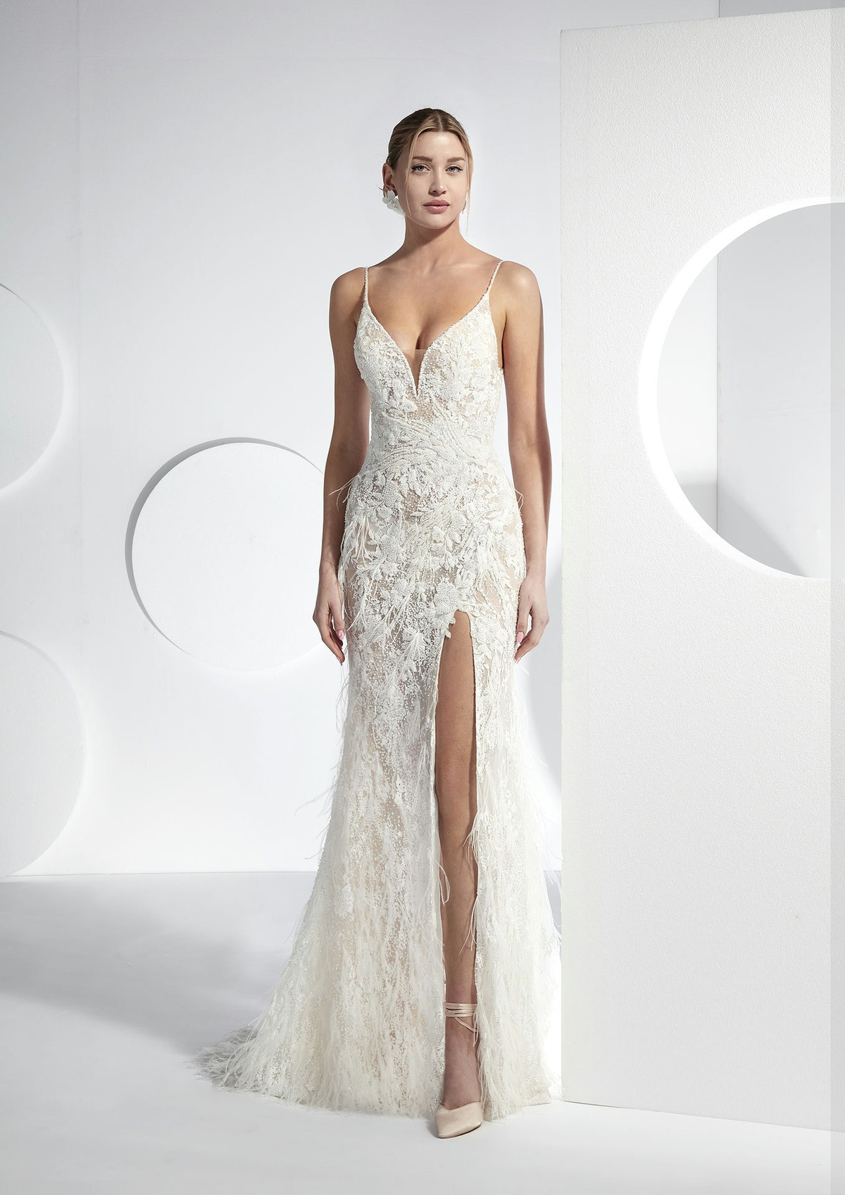 Deze pittige en chique jurk is perfect voor een glamoureuze stadsbruiloft of als een adembenemende tweede outfit. Met sierlijke kruislings bandjes voor een ondeugende rug, heeft deze aansluitende jurk een gedurfde split, versierd met glinsterende kralen en neerdwarrelende veren. De Alta Moda-collectie is op maat gemaakt voor bruiden met een scherp gevoel voor design, die gedurfde statements wilt maken en luxe wilt omarmen.