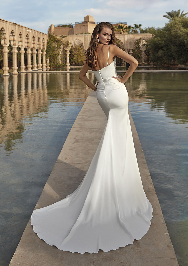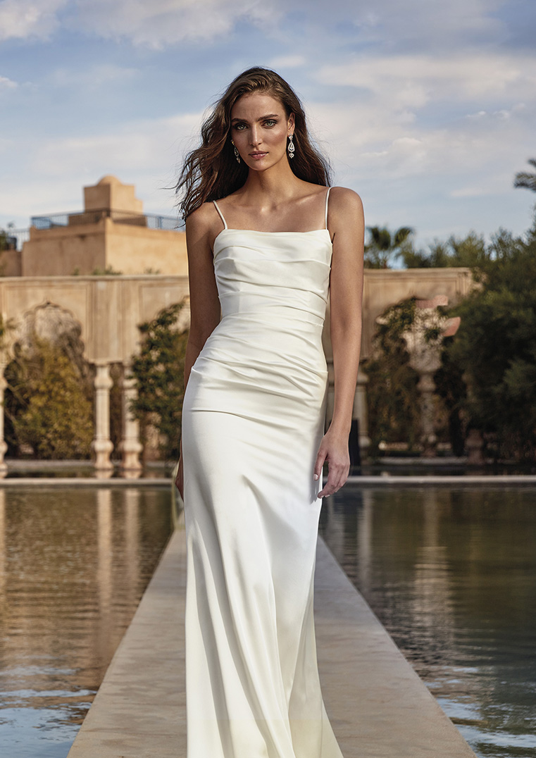 Betta is een elegante trouwjurk die je rondingen perfect laat zien. De satijnen stof heeft een mooie draperie wat een luxe uitstraling heeft. De jurk heeft een mooie boothals en smalle spaghettibandjes.