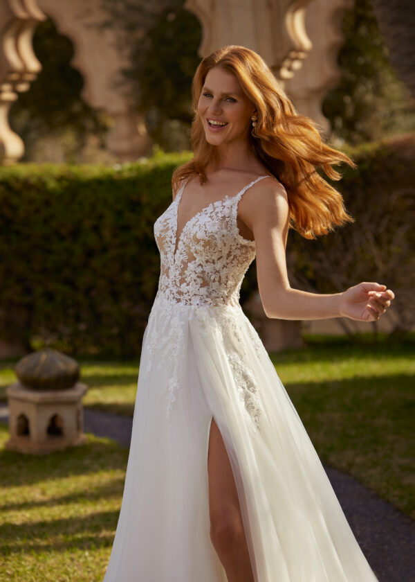 Deze jurk zal de aandacht trekken door de unieke stijl en details. De Catherin-jurk laat je je voelen als een prinses op je speciale avond, de verfijnde kanten details en glitter tule rok maken het een dromerig geheel. De kanten details lopen prachtig over in de tule rok met een sexy split.