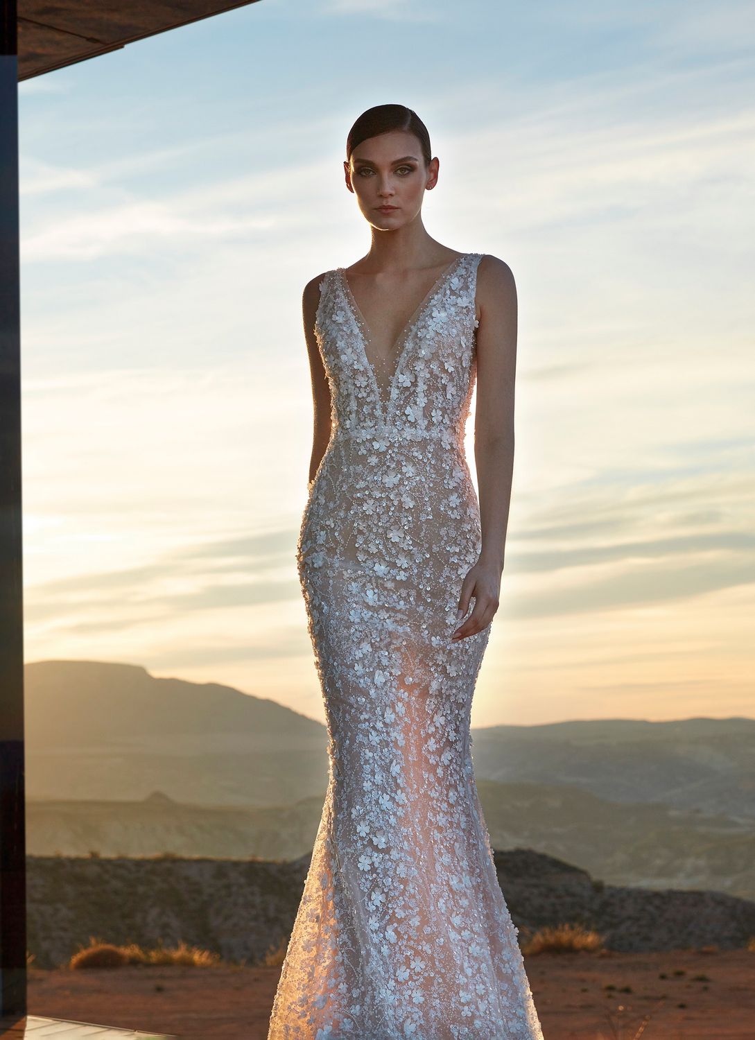 Een moderne en betoverende trouwjurk van Pronovias Privee met schitterend kralenwerk. Het ontwerp accentueert je silhouet met een strak lijfje met diepe V-hals en rug en een aansluitende rok die uitloopt in een elegante sleep. Voeg wat drama aan de jurk toe met het afneembare detail van tule met ruches op de schouders.