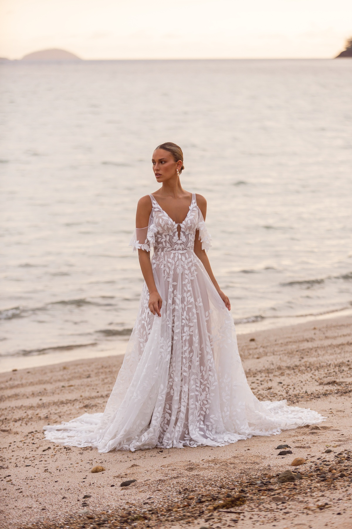 Omarm schoonheid en romantiek met de Jaya trouwjurk van Madi Lane. Deze jurk in A-lijnsilhouet heeft een diepe V-hals en fijne bandjes van tule. De versieringen met bladkant en pailletten verspreiden een glinsterende perfectie door de jurk en veroveren moeiteloos harten. Perfect voor elke bruiloftssetting, van intieme tuinaangelegenheden tot elegante kerkceremonies.