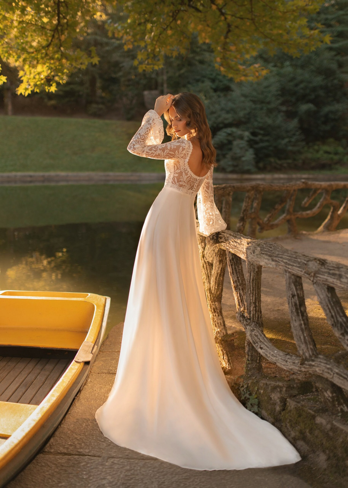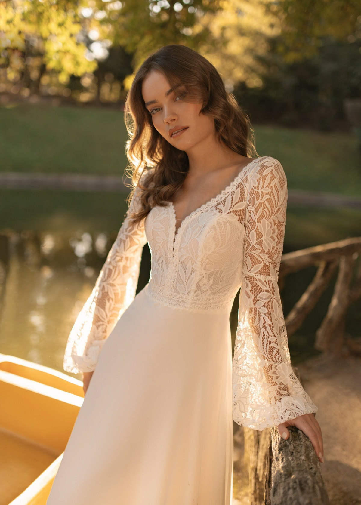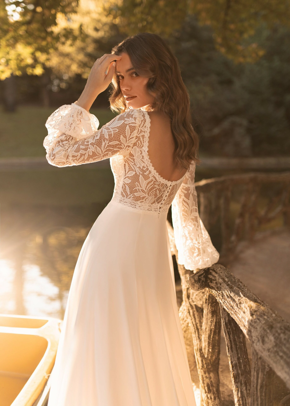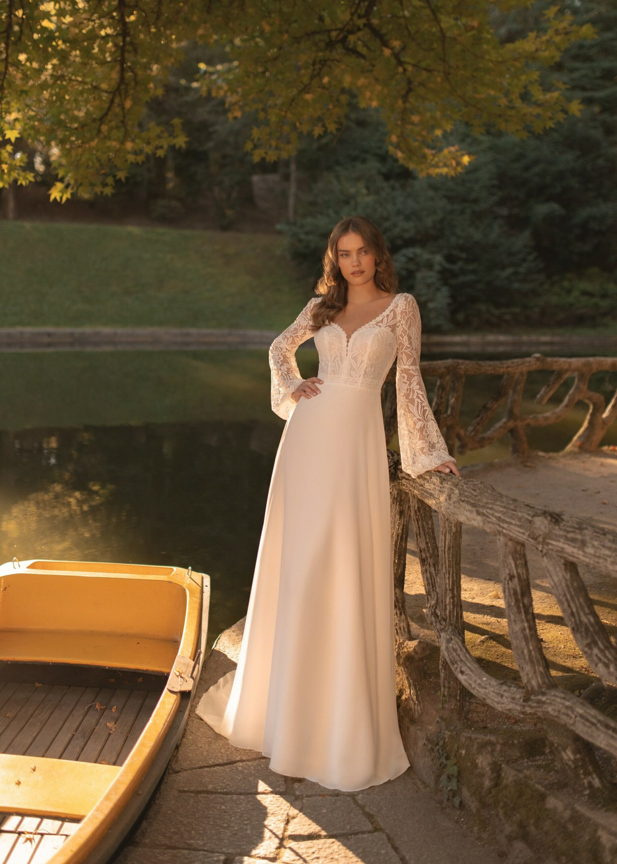 Deze A-lijnjurk heeft een verfijnd kanten lijfje versierd met kleine details. De lange kanten mouwen stralen verfijning uit, terwijl de chiffon rok een dromerig en romantisch silhouet creëert, perfect voor een sprookjeshuwelijk. Deze mooie trouwjurk staat ook heel mooi bij een curvy body.