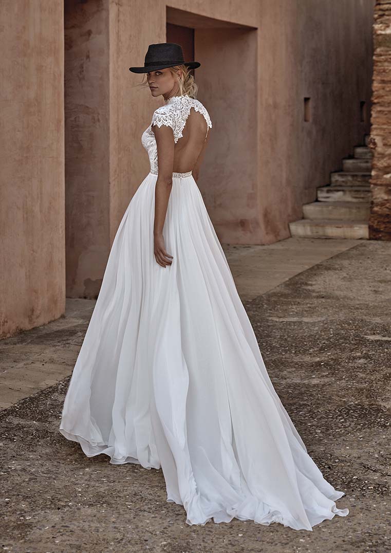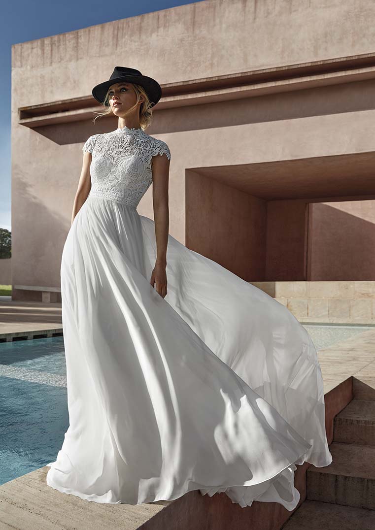 De Marburg A-lijn trouwjurk van Pronovias straalt tijdloze elegantie uit met een moderne twist. De hoge halslijn voegt een eigentijds element toe aan het klassieke silhouet, terwijl het prachtige kanten ontwerp een vleugje romantiek biedt. De zachte vloeiende rok en delicate details is deze jurk een prachtige keuze voor bruiden die op zoek zijn naar een combinatie tussen bohemien, klassiek en traditioneel.