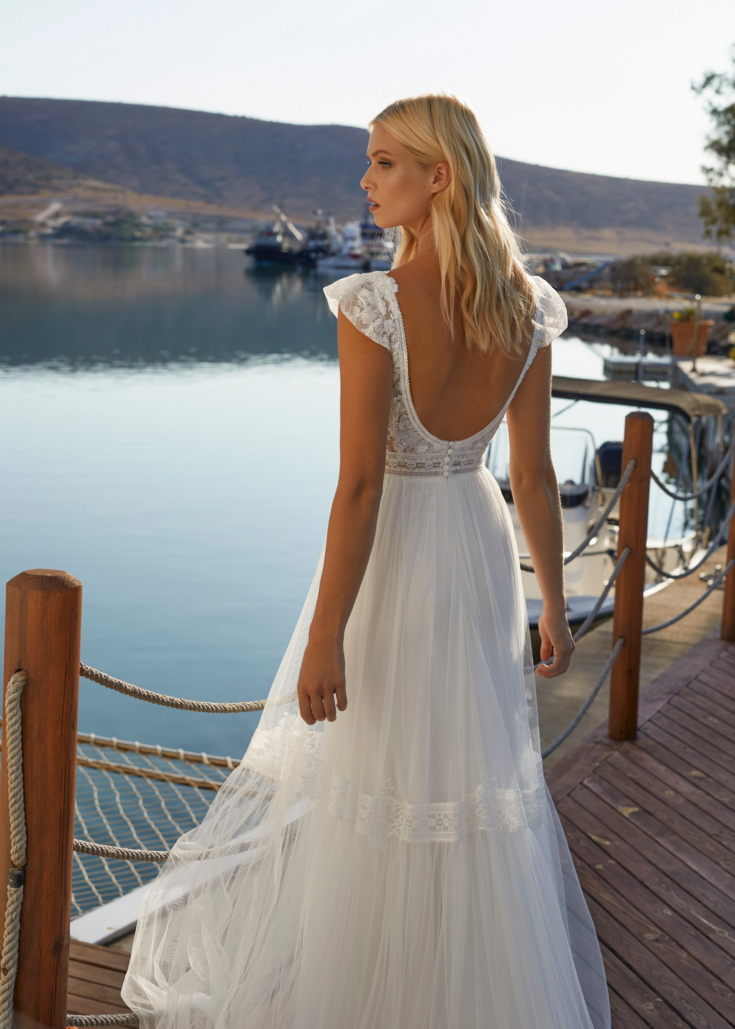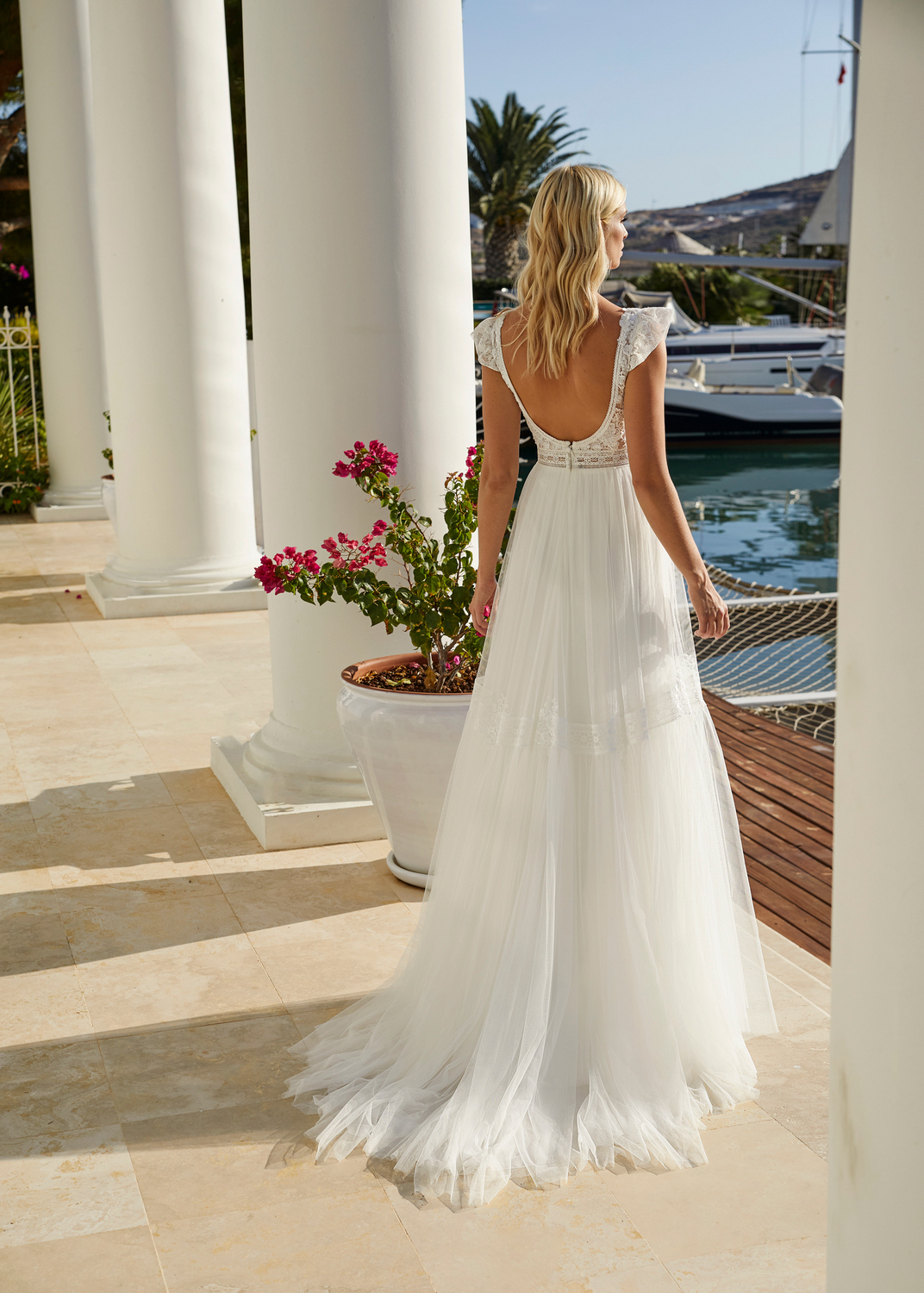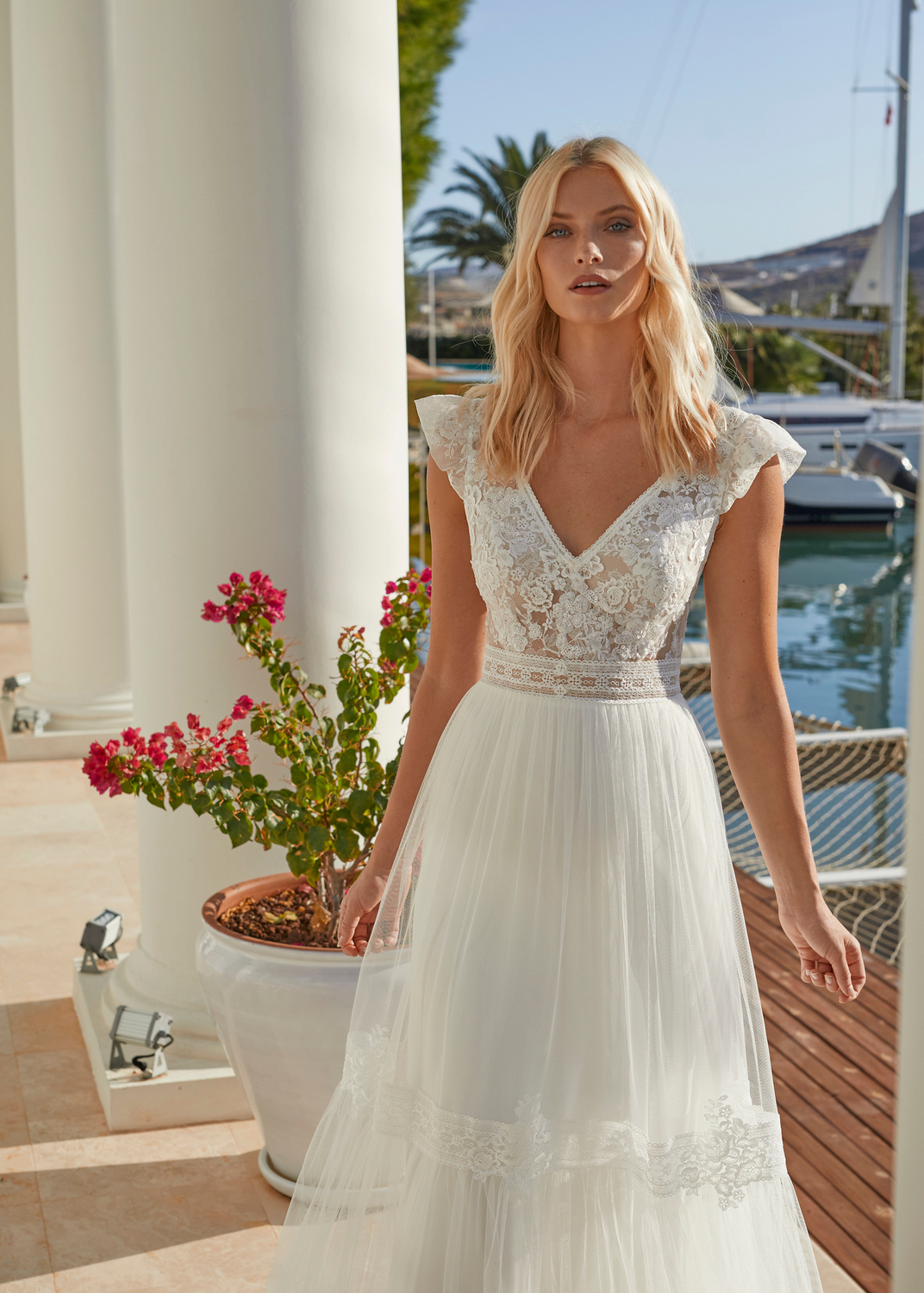 Romantisch met een bohemian touch, dat is de Noon van Modeca zeker. Een prachtig bewerkte top met een soepel vallende A-lijn rok. Verder heeft deze topper een mooi kapmouwtje, kortom de boho-droom voor elke bruid!