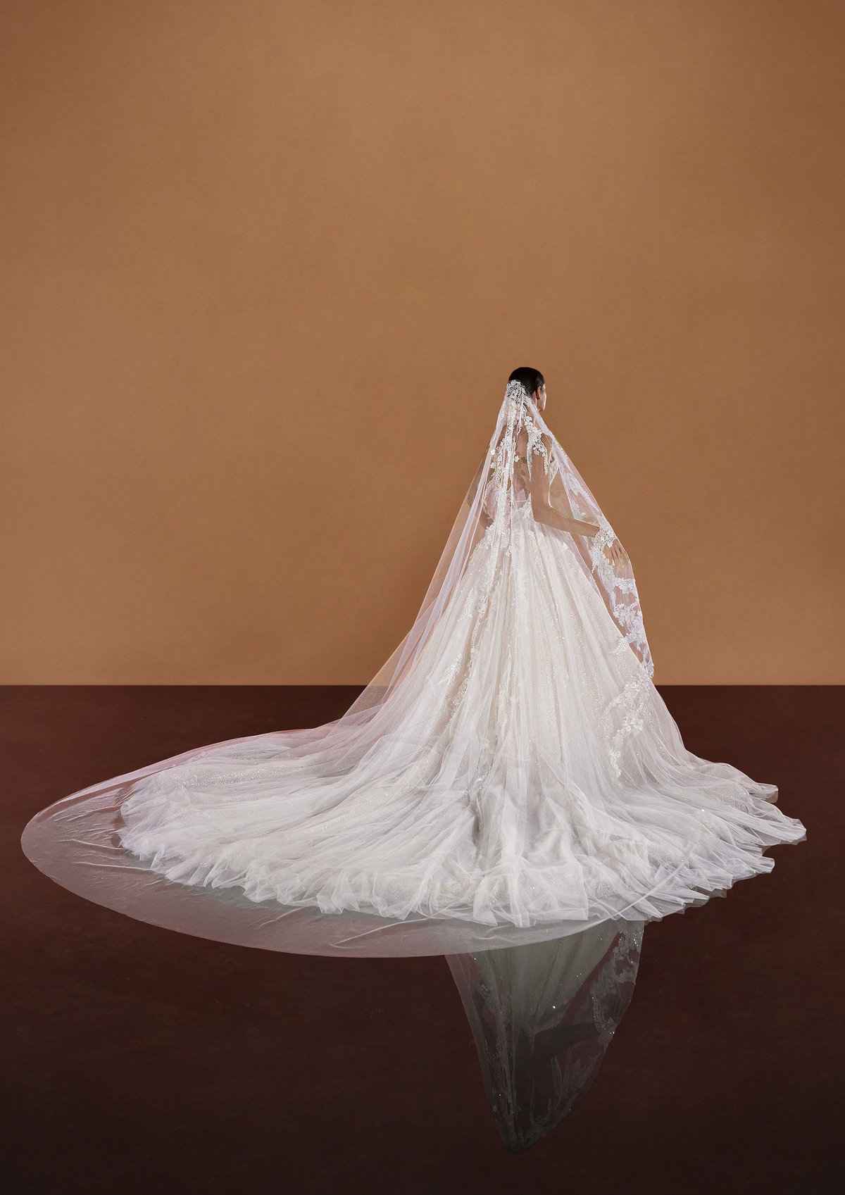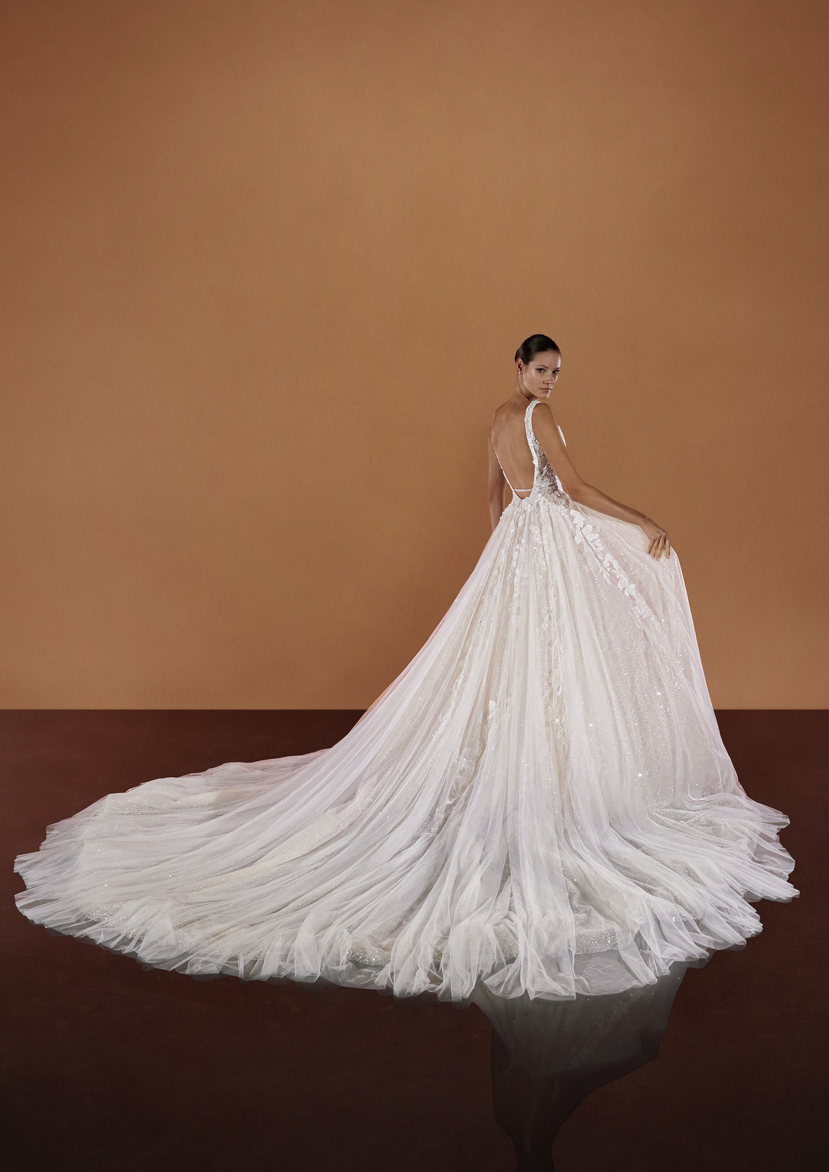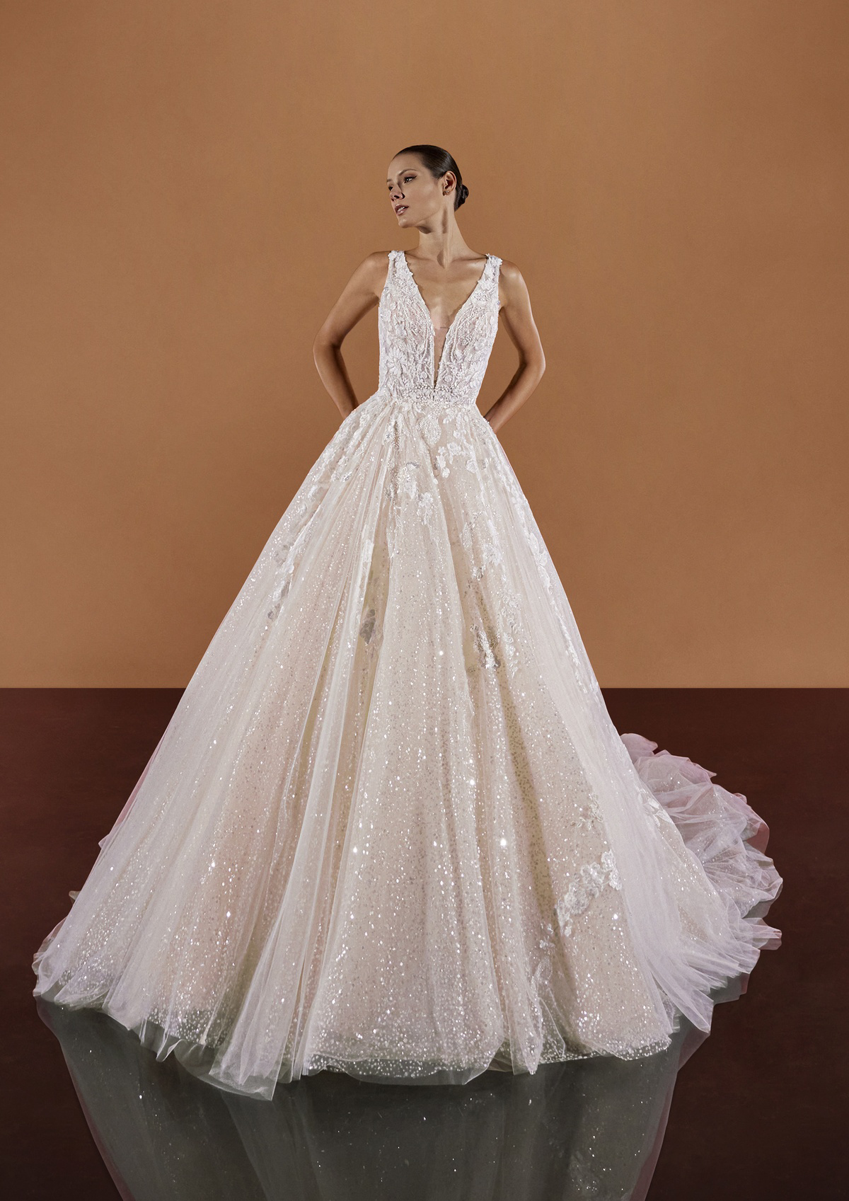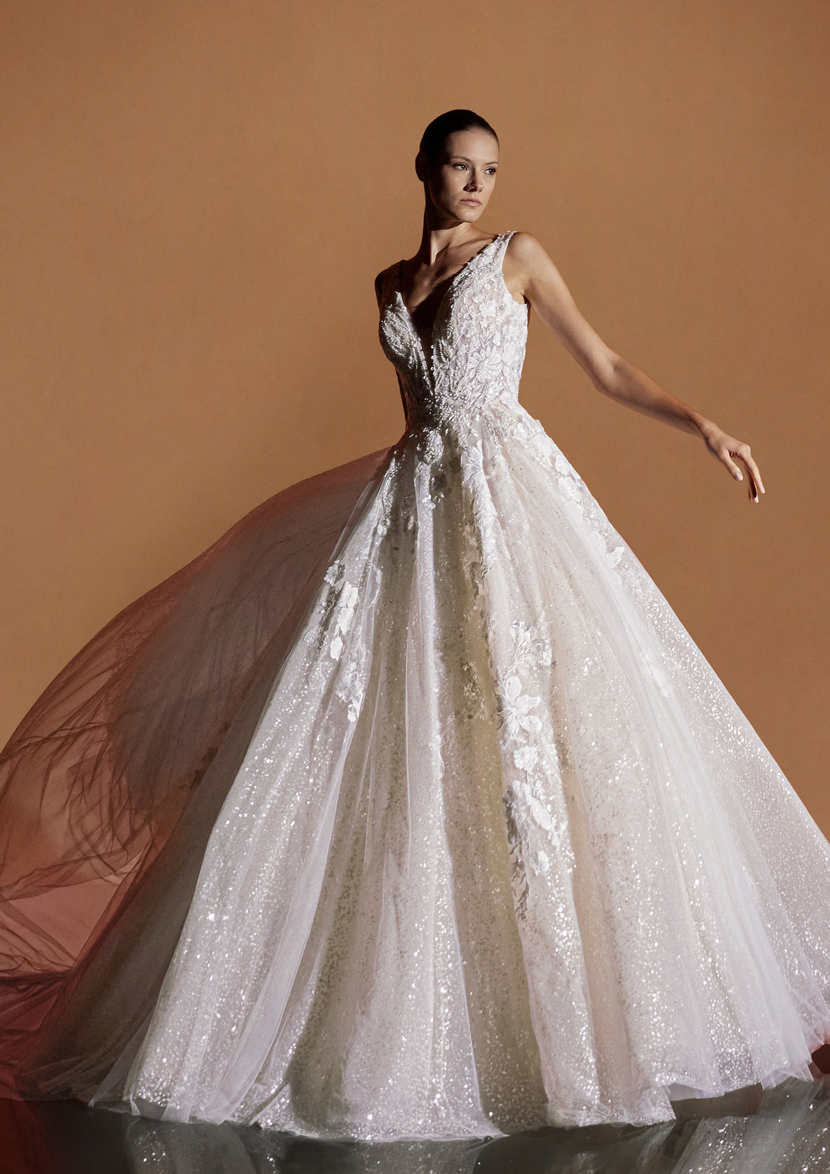 Een elegant prinsessenmodel, getailleerd bij de taille, gemaakt van sprankelende stof. Het lijfje heeft bijpassende V-halslijnen aan de voorkant en achterkant, terwijl bloemendetails het lijfje en de vloeiende rok sieren.