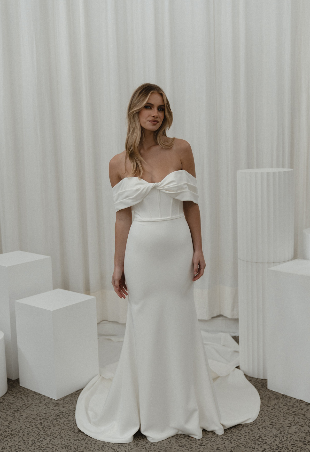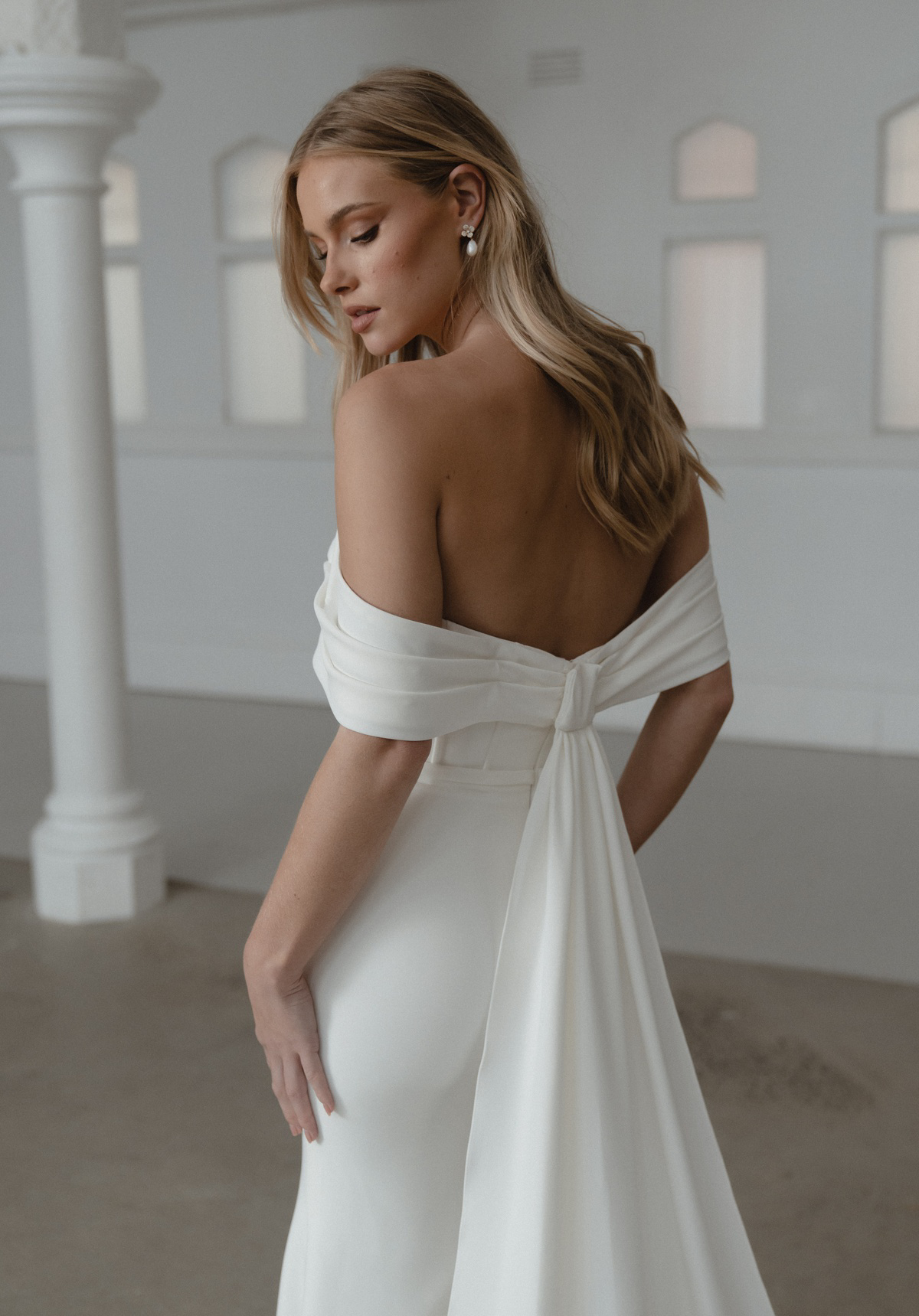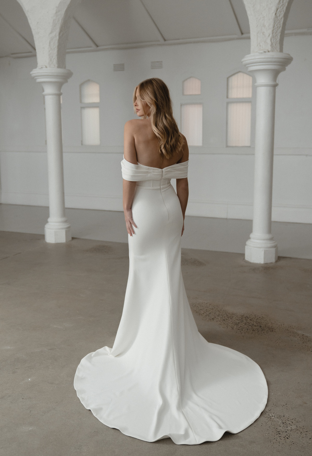 Maak kennis met Soren, het toppunt van elegante eenvoud in een trouwjurk. Als onderdeel van onze 'Memoirs: The Epilogue'-collectie richt ze zich op de hedendaagse bruid die houdt van minimalistische ontwerpen. Soren is zorgvuldig vervaardigd en heeft een fit-and-flare-silhouet, dat perfect tijdloze allure uitstraalt. Haar lichte crêpe met jerseyvoering zorgt voor verfijning bij elke stap. Met zichtbare corsetdetails en een strik op de halslijn straalt Soren allure uit, maar blijft moeiteloos ingetogen. Til je speciale dag naar een hoger niveau met Soren, de belichaming van de dromen van de moderne minimalistische bruid.