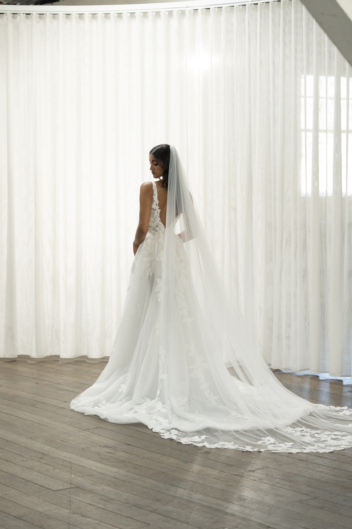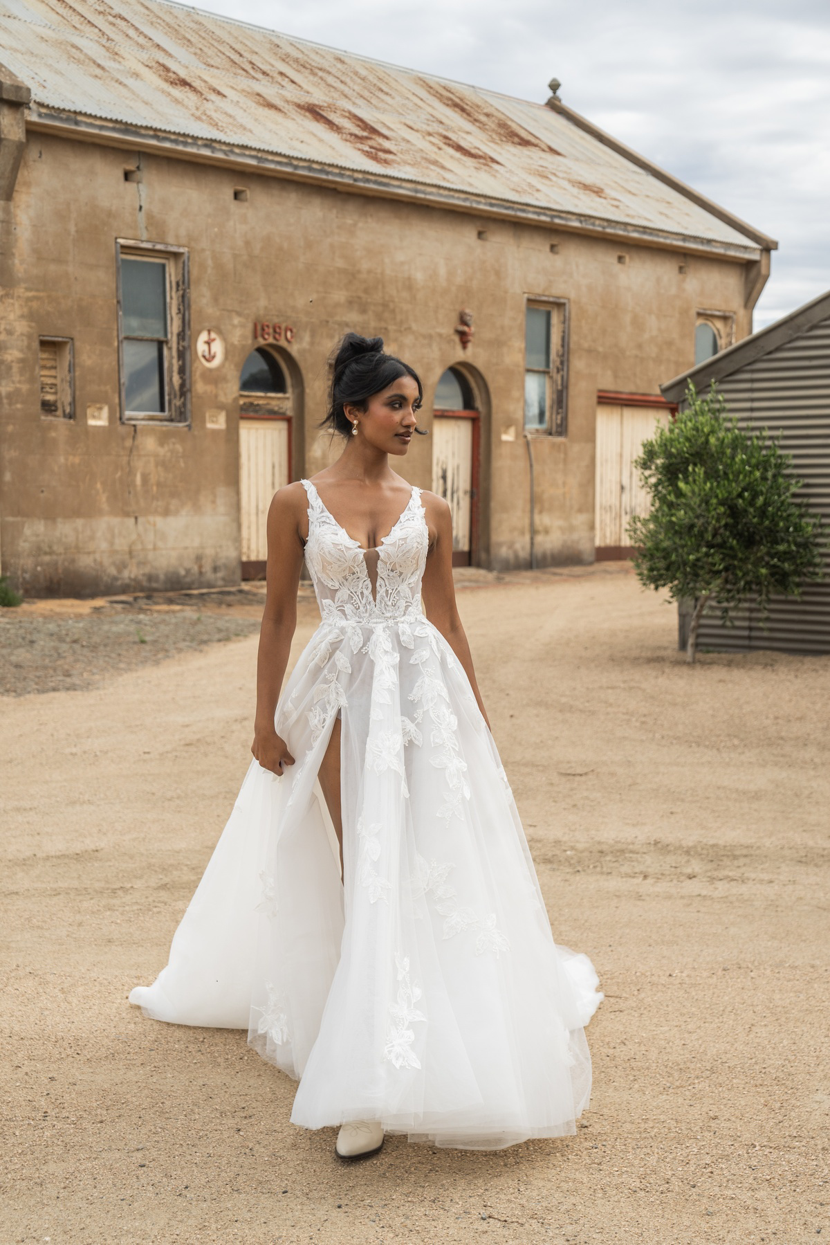Romantiek en Madi Lane gaan hand in hand, en niets drukt dit beter uit dan onze Tala trouwjurk uit onze Ceres collectie. Met de klassieke Madi Lane signature look combineert Tala een licht en luchtig A-lijn silhouet met overvloedige abstracte pailletten bloemenborduursels om te moderniseren. Ze heeft een V-vormige halslijn en heeft een baleinen constructie voor pasvorm en vorm. Licht doorschijnende zijpanelen piepen naar buiten om de taille te benadrukken en vloeien vervolgens over in haar zachte A-lijn rok met lagen tule om precies de juiste dekking te creëren en de mooie split goed tot zijn recht komt. Doorlopend door de achterkant, heeft een lage V-vorm met kantmotieven die doorsijpelen naar de sleep. Stap in het etherische licht met een prachtige zachte esthetiek die bij elk bruiloftsthema past. Heeft ingebouwde nude shorts of kan desgewenst worden gevoerd. Getoond in ivoor. Om nog meer lichtheid en abstracte geborduurde details toe te voegen, combineer je de jurk met de Tala sluier.