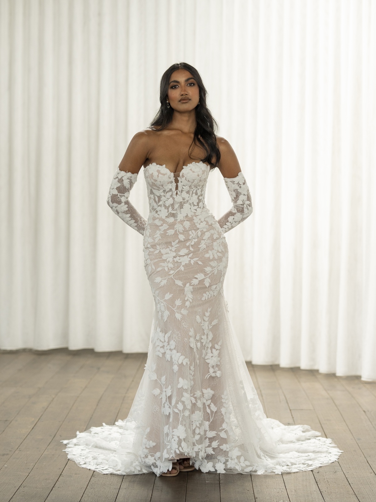 Stap in de wereld van ultra vrouwelijk en sexy met onze Thane trouwjurk van het merk Madi Lane. Geïnspireerd op wijnranken en Chantilly-kant, creëert deze jurk diepte en detail. De lichte deuk in de sweetheart halslijn en het doorschijnende lijfje zorgen voor een sculpturale uitstraling. De wijnrank kant en moderne V-vormige Baskische taille zorgen voor een frisse en moeiteloze look. De lange kanten mouwen, geborduurd met pailletten, voegen drama toe aan deze verbluffende creatie.