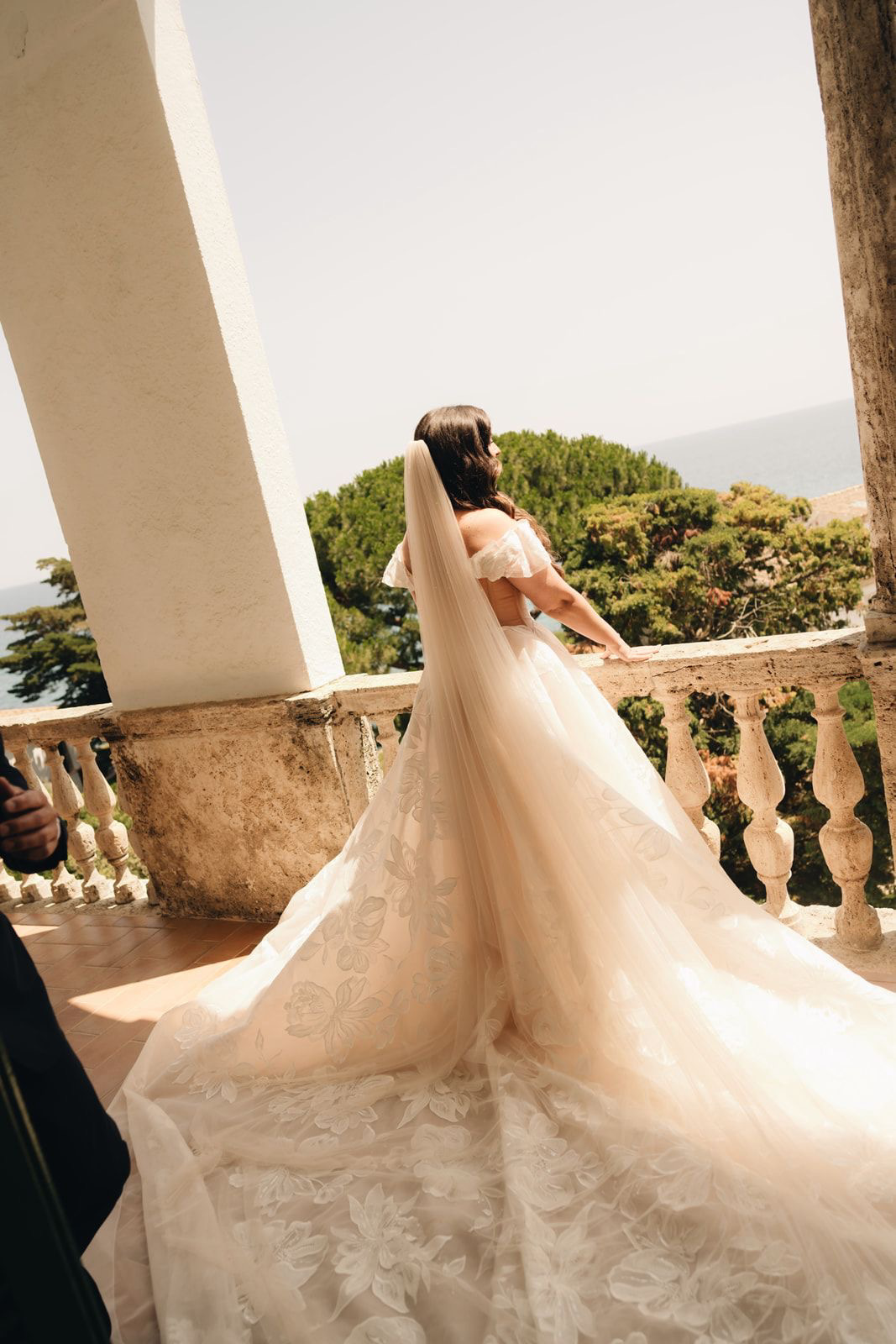 Leslie Keijzer droeg tijdens de ceremonie het model de Evelyn van Galia Lahav. De Evelyn is een romantische en spectaculaire keuze om mee naar het altaar te lopen. De trouwjurk heeft grof kant van geborduurde Spaanse bloemen, gecombineerd met een see-through korset lijfje voor een gedurfde, maar elegante uitstraling. De see-through zijpanelen accentueren de taille mooi en de rug is afgewerkt met kanten applicaties. De Evelyn is verkrijgbaar in ivoor of een zachte blush kleur voor een unieke, persoonlijke touch. Leslie straalde in de Evelyn in de blush kleur en we stylden het af met een bijpassende sluier in dezelfde kleur. Het plaatje werd compleet met prachtige minimalistische sieraden en geweldige bruidsschoenen!