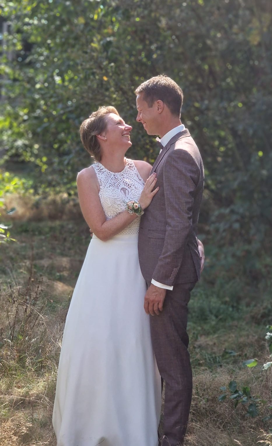 Na toch wat angst om in een trouwjurk naar mijn bruiloft te gaan kwam ik met knikkende knieen binnen. Maar als snel verdween de angst en ging ik langzaam stralen. Al hoewel ik mijn jurk niet direct gevonden kreeg, gaven jullie niet op en kwamen met de oplossing. ‘Van twee jurken één maken.’ En zo stond ik met de tranen in mijn ogen met twee jurken aan voor de spiegel. Nooit gedacht dat ik zo gelukkig zou worden.