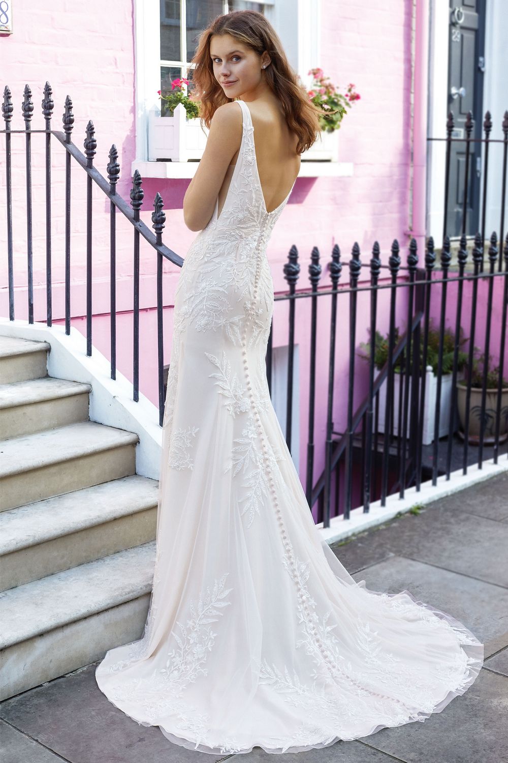 Deze bijzonder mooie trouwjurk is van het merk Adore. Met zijn Fit & Flare silhouette, diepe V-hals aan de voor en aan de achterkant en uitsnijdingen onder de armen staat hij heel elegant en laat hij de bruid de hele dag stralen. Het geborduurde en bewerkte kant, evenals de pickpak knoopjes waarmee de jurk wordt gesloten, lopen vanaf het bovenlijf helemaal tot aan de onderkant van de jurk en de sleep.