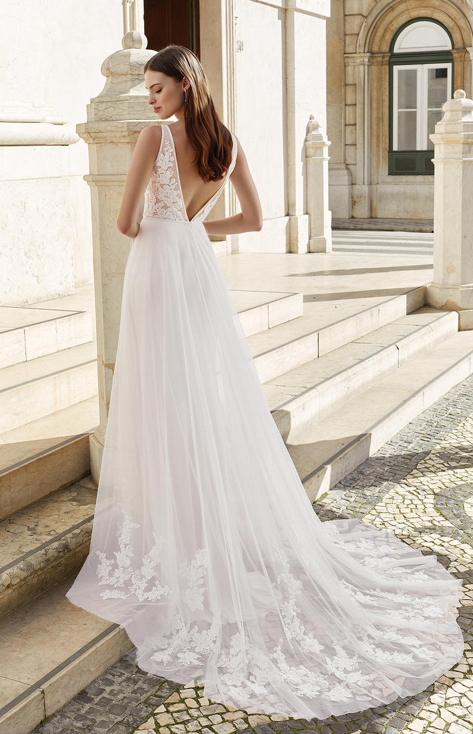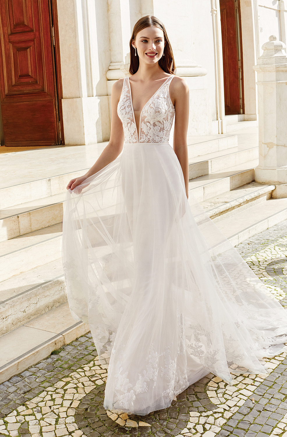 Een romantische trouwjurk van het merk Adore. Een schitterend see through bovenlijfje met een diepe V-hals aan de voorkant en aan de achterkant van de trouwjurk. De afgebiesde panden zijn gevuld met prachtig gebloemd kant. De nadruk wordt door de smalle belt gelegt op de taille en de zwierige rok zorgt voor een mooie A-lijn. Als extra detail heeft de trouwjurk het prachtige kant nog eens verwerkt in de sleep.