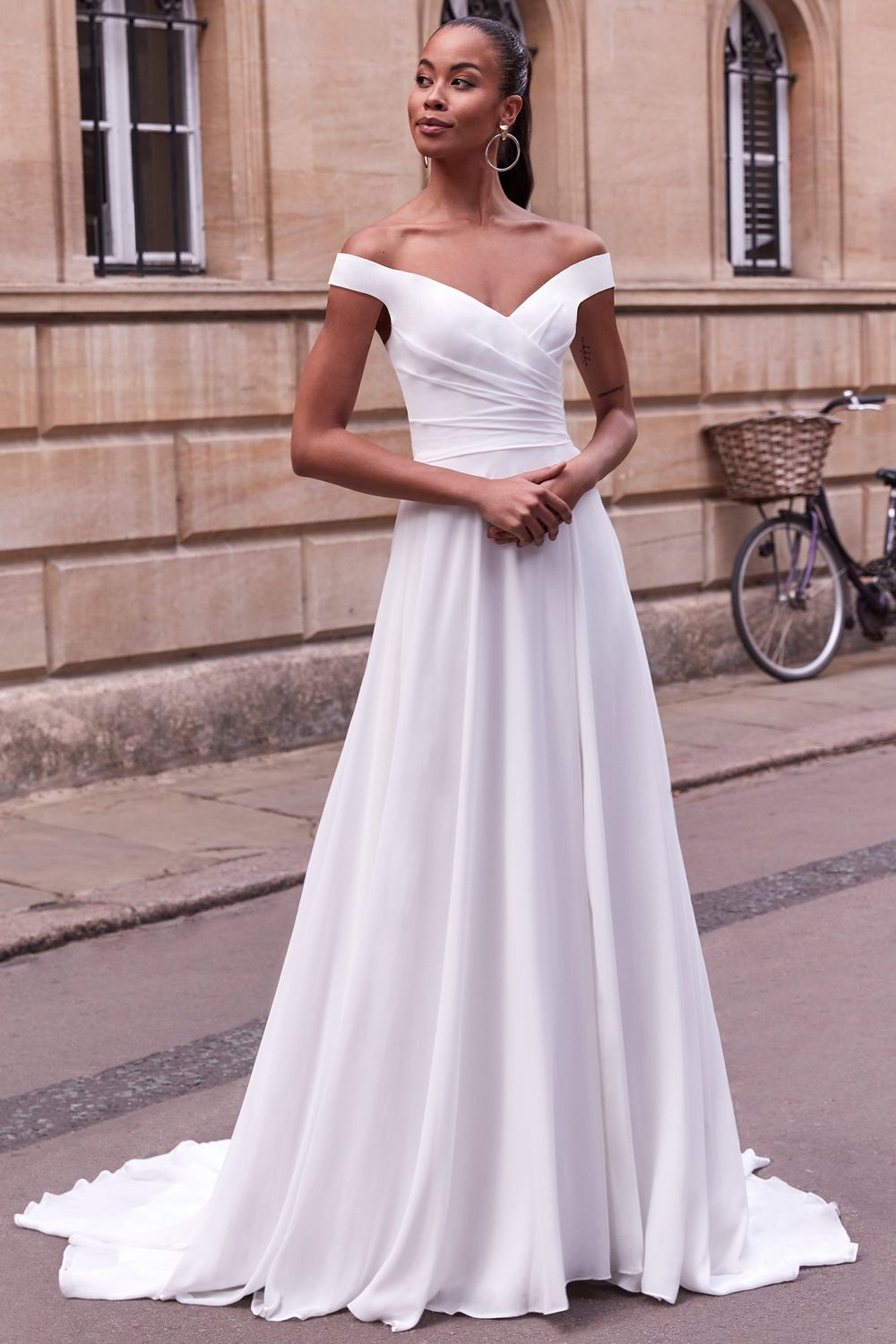 Dit is toch wel een hele bijzondere trouwjurk van Adore. Prachtige vallende Chiffon, waardoor hij heerlijk licht en luchtig draagt. De off shoulder bandjes en het geplooide bovenlijfje, zorgen voor een extravagante uitstraling. De rok valt dicht als je stilstaat en als je loopt zie je een split tot net boven de knie. De trouwjurk is afgewerkt met picpac knoopjes tot onder aan de sleep die zorgen voor de finishing touch.