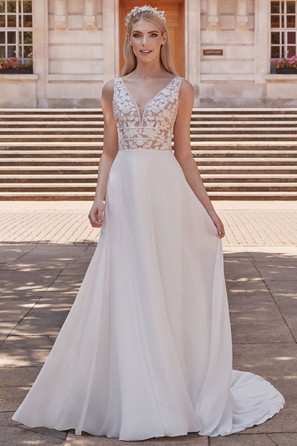 Een prachtige trouwjurk voor de bruid die houdt van een bohemian touch. De diepe v-hals creëert lengte en de tonale kralen versiering op het lijfje geven jou een slanke pasvorm. Ook de rug is diep uitgesnede. De rok is zeer soepelvallend, effen en mooi in verhouding met het kanten, doorschijnende lijfje.