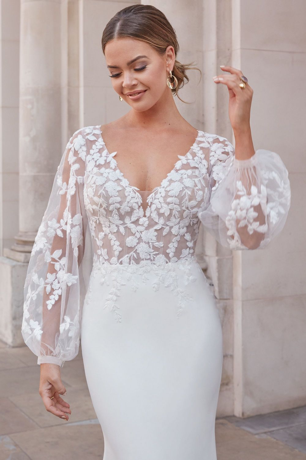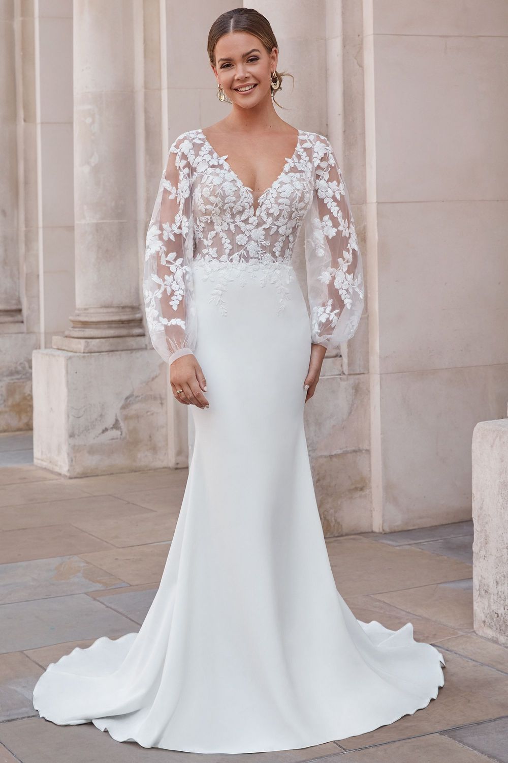 Voor de bruid die op zoek is naar een unieke trouwjurk is deze van Adore een superjurk. Deze stretch-crepe fit & flare pasvorm geeft jou een sexy look. Het doorschijnende lijfje heeft zachte katoenen applicaties met luchtige mouwen. Ook de rug is sexy door de illusie look.