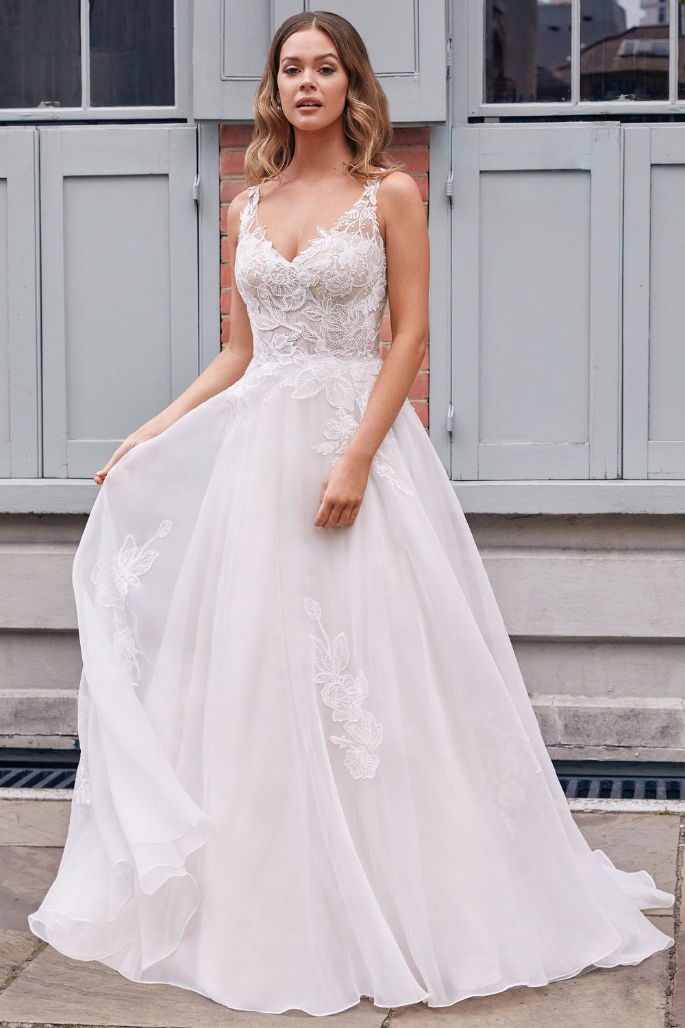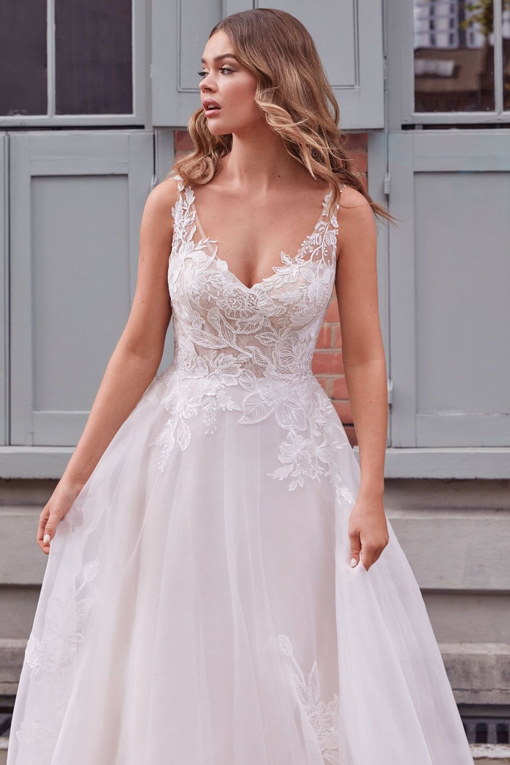 Een romantische trouwjurk die door middel van de a-lijn jouw taille mooi accentueert. De v-hals is prachtig uitgesneden en het lijfje heeft dromerige kanten applicaties. De illusie rug geeft jou een sexy look.