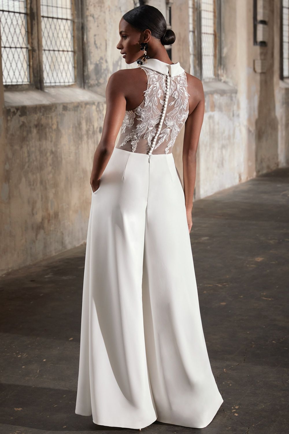 Voor de bruid die op zoek is naar een jumpsuit voor haar grote dag is heeft Justin Alexander de Bonnie ontworpen voor de Adore lijn. Deze jumpsuit is perfect voor de moderne bruid en heeft een flatterende V-halslijn. De rug is gemaakt van een doorschijnende stof waar prachtige kanten applicaties op geborduurd zijn voor een flirterige look. De jumpsuit is gemaakt van een crepe stof die prachtig meevloeit met jouw bewegingen.