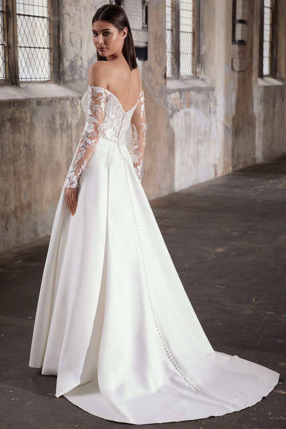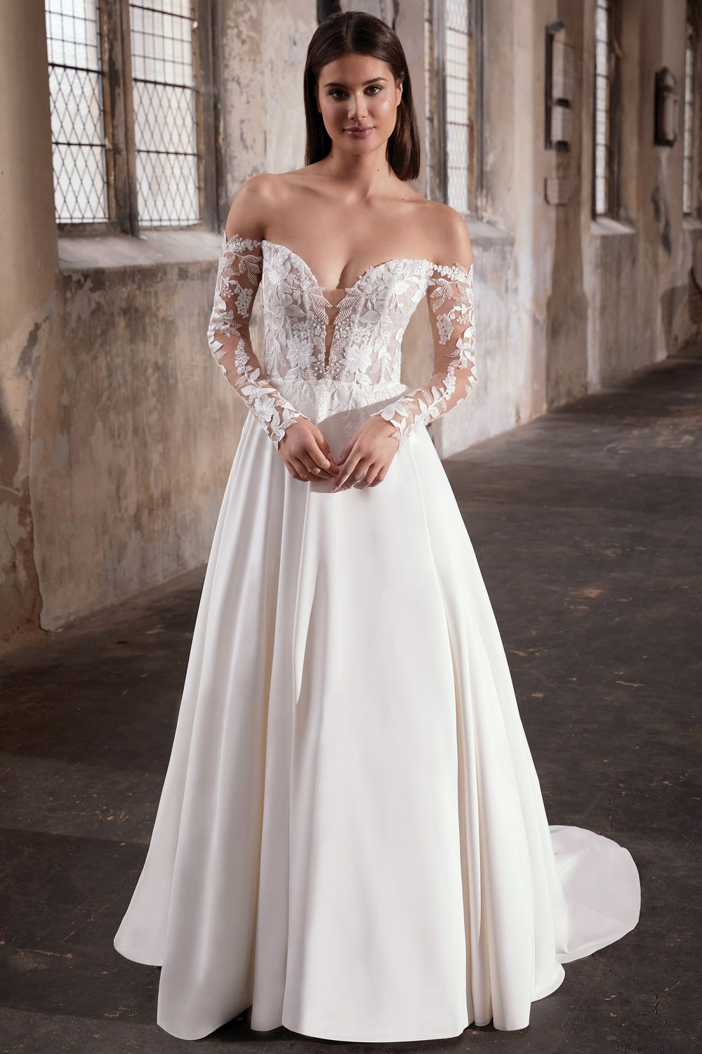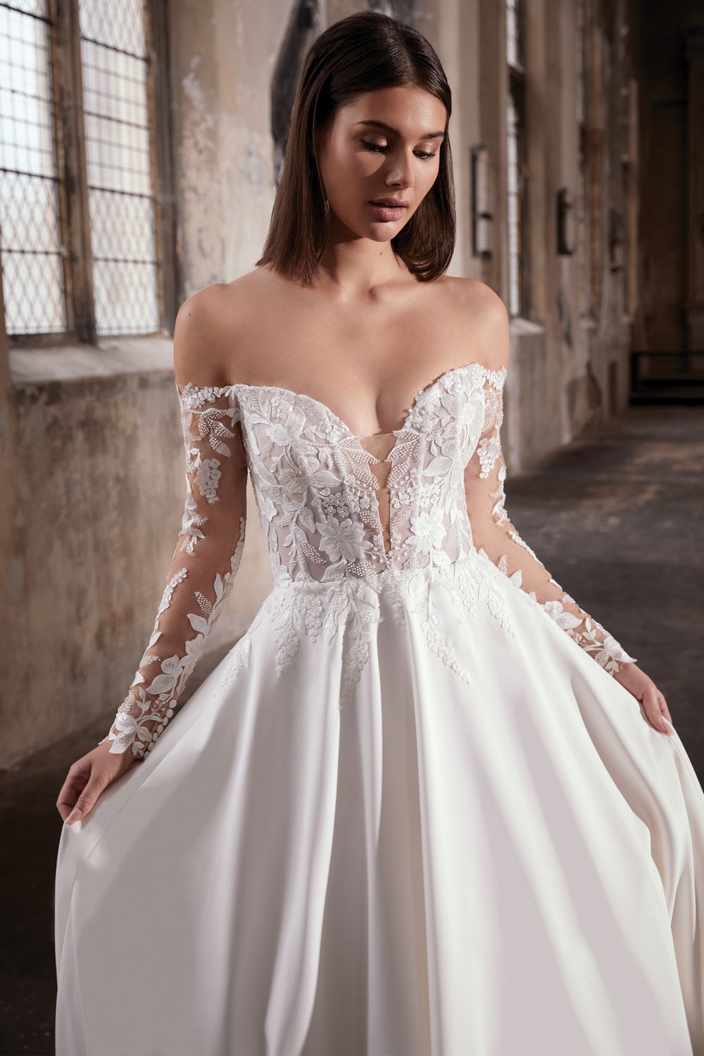 Deze bijzondere trouwjurk is de Bella van het merk Adore. Dit A-lijn model met een rok van satijn is zeer geschikt voor alle bruiden. Het doorzichtige lijfje met diepe V-hals en lage rug is bedekt met prachtige bloemen met kralen. De off-shoulder mouwen met dezelfde kant als op het lijfje maken deze trouwjurk helemaal af.