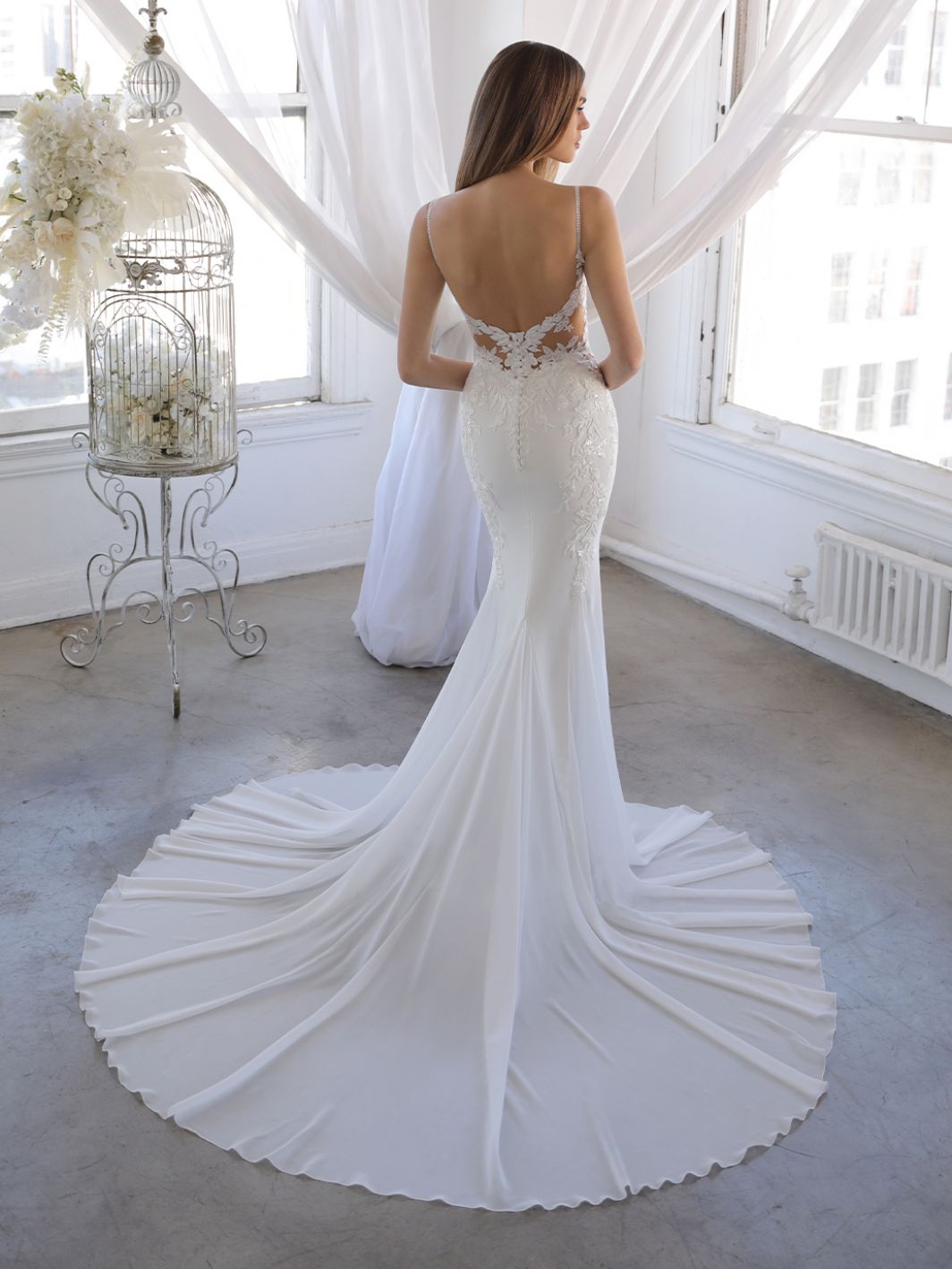 De Ornina trouwjurk uit de Blue by Enzoani-collectie is een prachtige combinatie van tijdloze charme en eigentijdse details. Het gedetailleerde kanten lijfje, versierd met subtiele parels, vormt een schitterend contrast met de moderne illusie-halslijn. De jurk gaat over in een zachte crepe rok. Het mermaid silhouet accentueert jouw rondingen en de waanzinnige sleep zorgt voor prachtige fotomomenten.