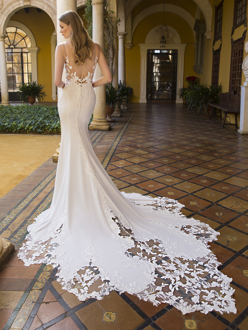 Voel je mooi en elegant in deze oogverblindende trouwjurk! Op zoveel manieren is deze jurk uniek, de illusie korset versierd met dikke kanten applicaties op het lijfje is één van de redenen. De v-hals en de lage illusie rug zorgen voor een romantisch effect. De effen rok in fit & flare pasvorm zorgt voor een mooi contrast met het lijfje. Ook zal de fantastische sleep zeker ieders aandacht trekken.