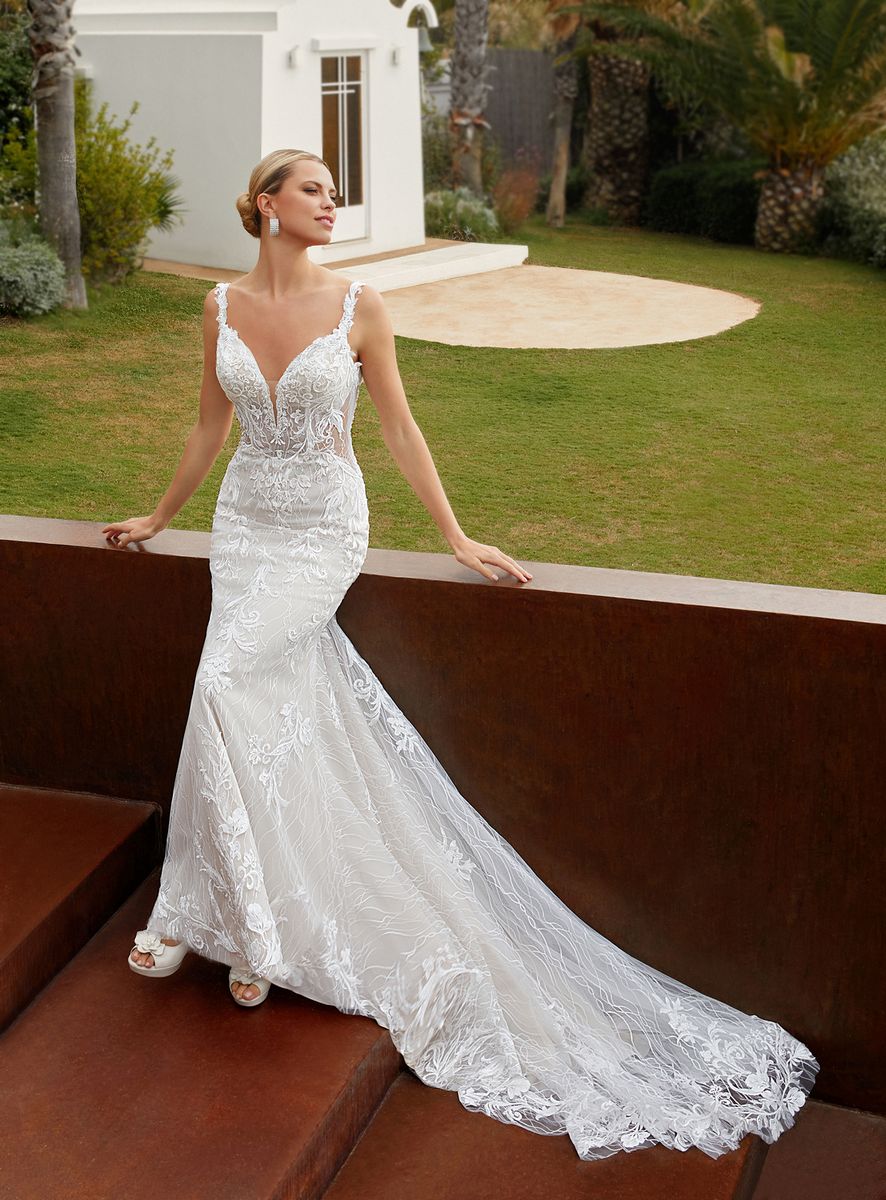 Deze prachtige jurk is versierd met decadent geborduurd kant en heeft een flatterend silhouet met een diepe Sweetheart halslijn en transparante accenten. De delicate kanten bandjes vloeien over in een sexy diepe V-rug en de Fishtail sleep zorgt voor de perfecte finishing touch. Of je nu je trouwt in een grote balzaal of in een intieme tuin, in deze jurk zal je shinen!