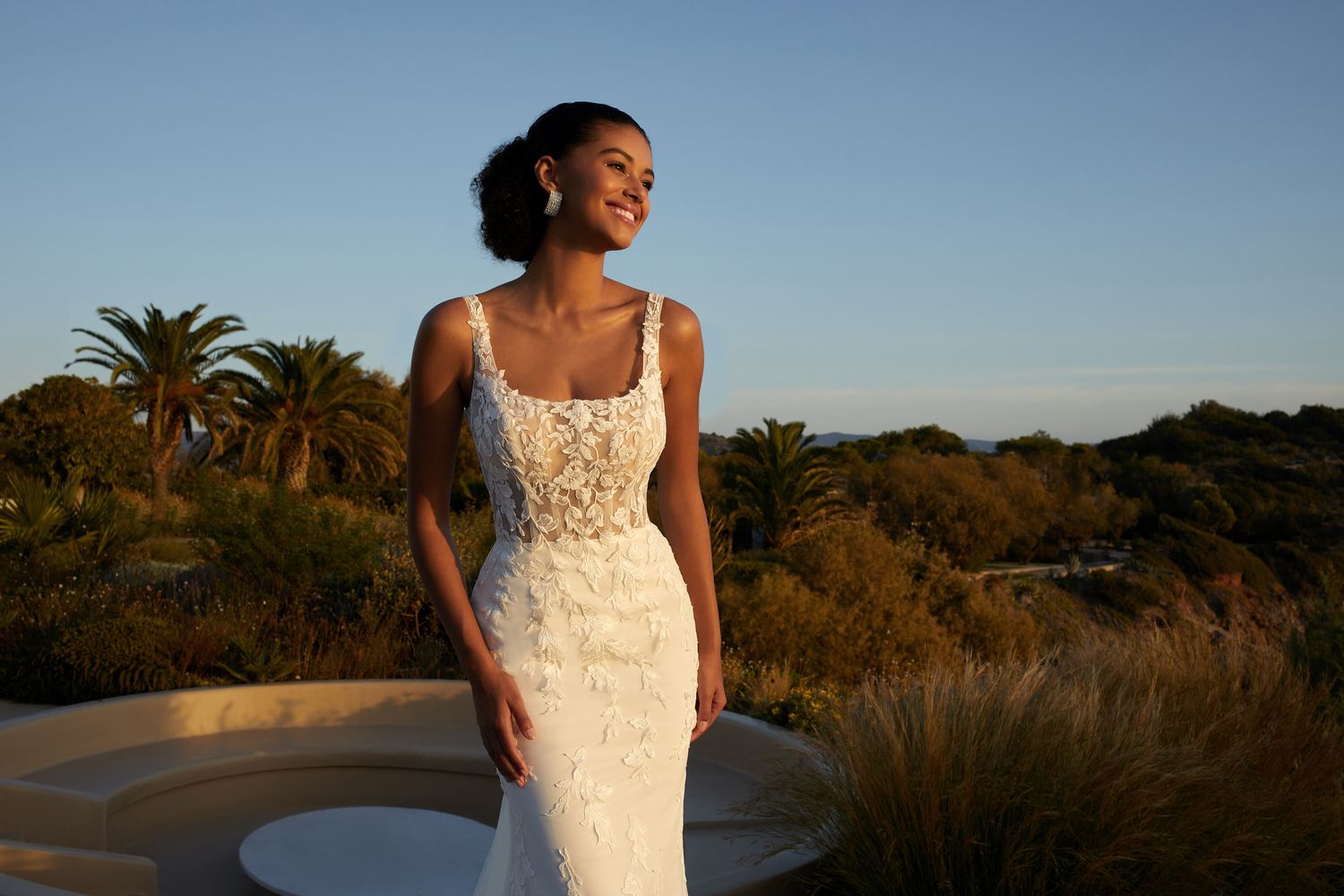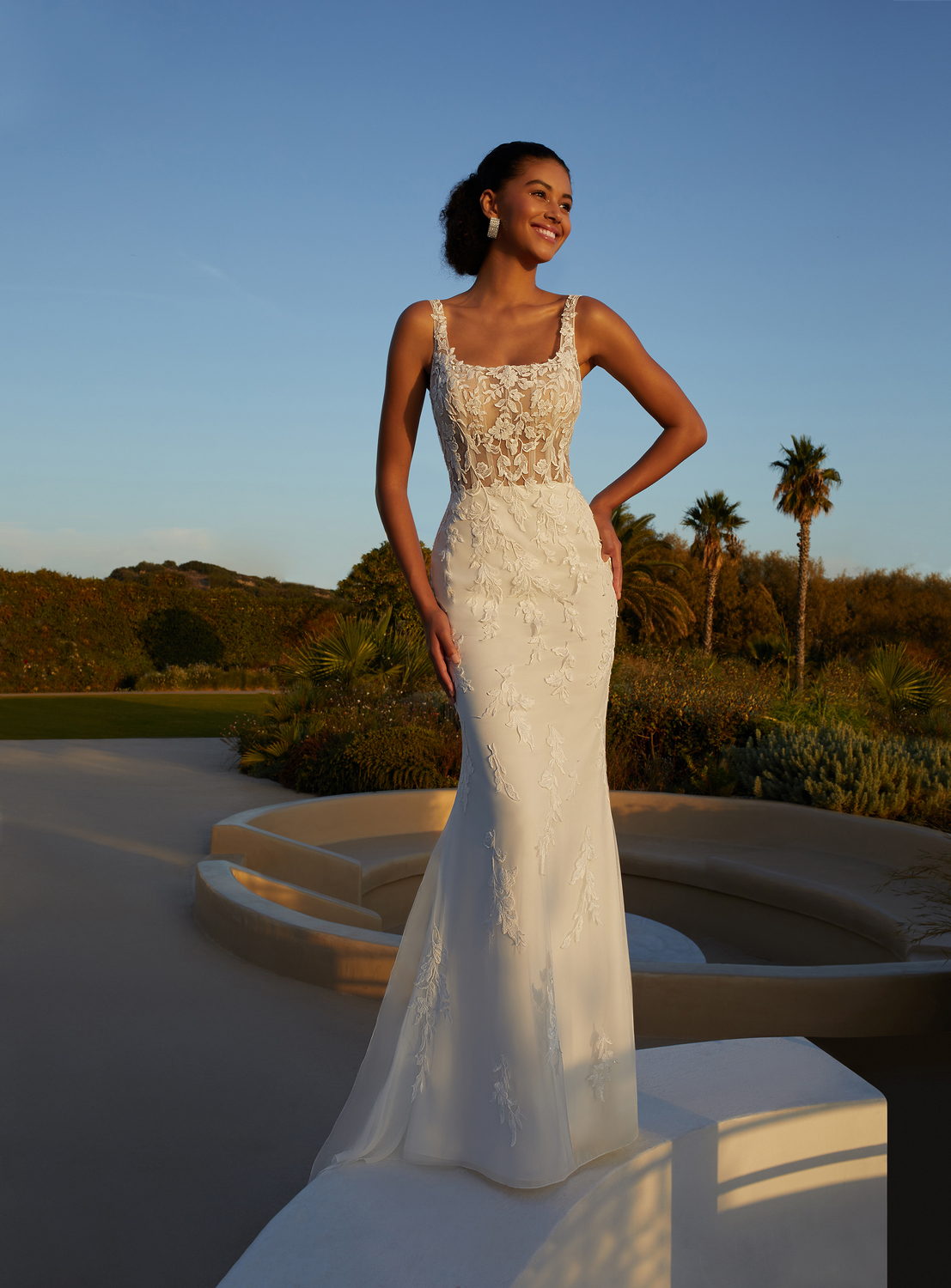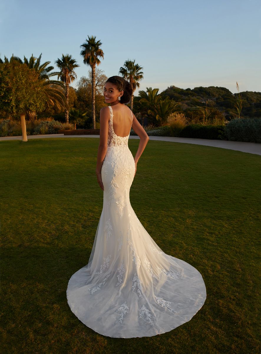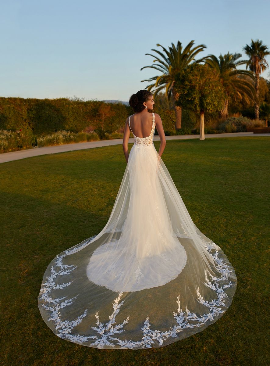 Elegant door de vierkante hals en vrouwelijk door de fit & flare pasvorm. Het doorschijnende lijfje heeft een illusie korset en is bedekt door delicaat kant in bloemen- en bladmotieven. Over de effen rok valt een prachtige tule sleep gedecoreerd met kanten applicaties. Deze two-piece jurk geeft je een vintage gevoel en is zeker geschikt voor jouw bruiloft op het strand, in een kasteel of mooie tuin.