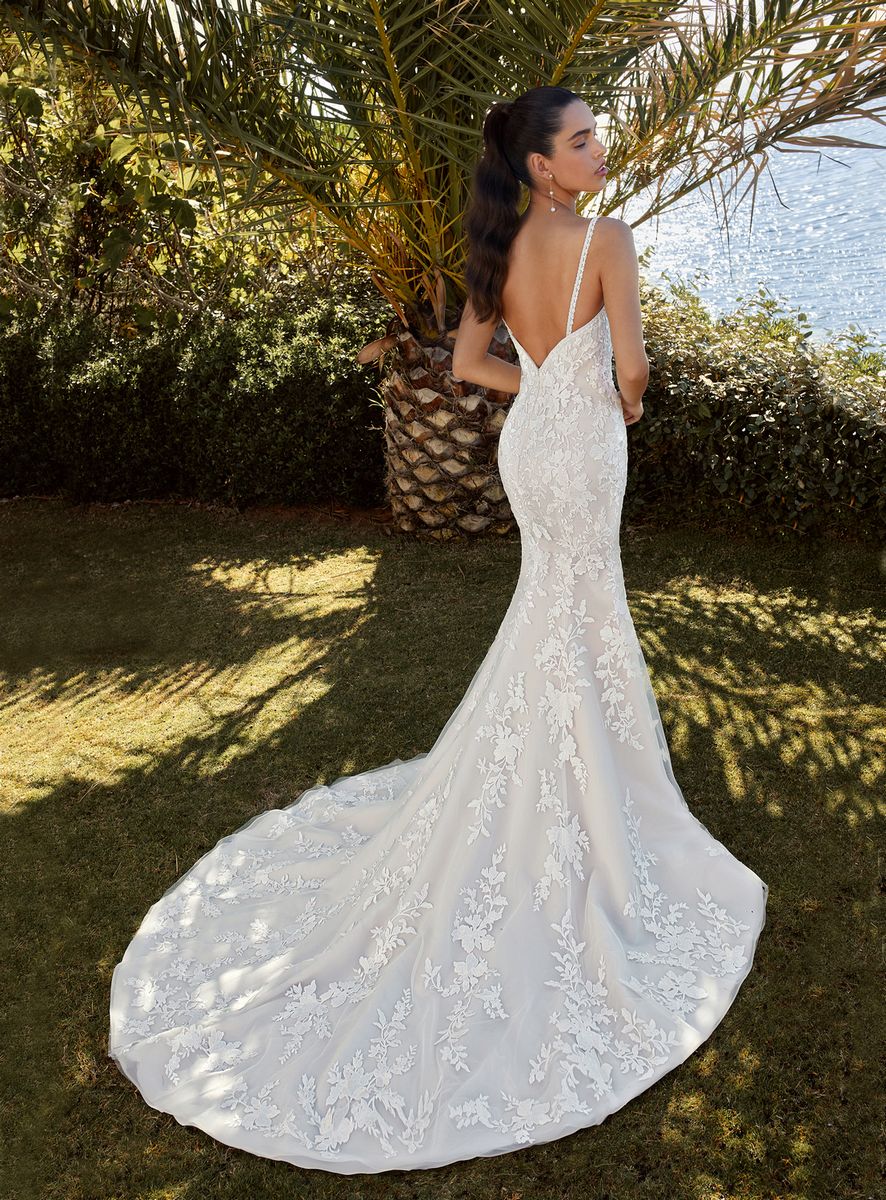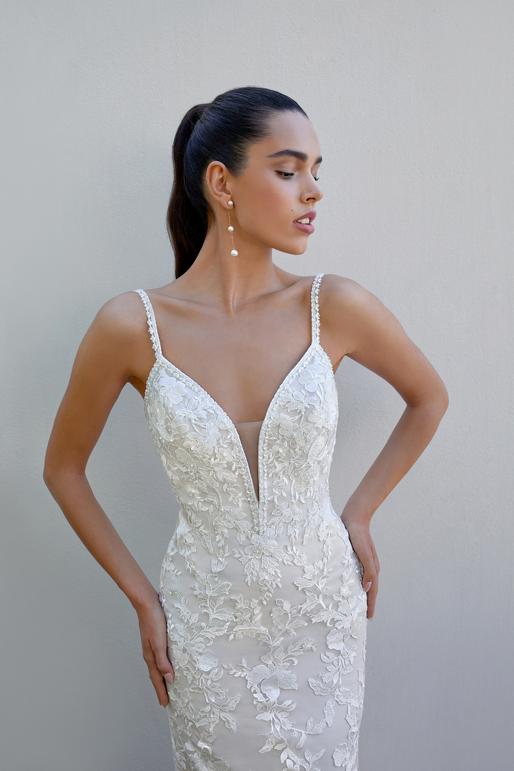 Voor een Vintage gevoel en om jouw figuur prachtig uit te laten komen is deze trouwjurk zeer geschikt. De fit & flare pasvorm zorgt hiervoor in combinatie met de diep uitgesneden v-hals. De weelderige kanten applicaties geven een luxe touch aan de jurk, net zoals de sierlijke schouderbandjes. Als finishing touch geeft de lage rug een sexy sfeer.
