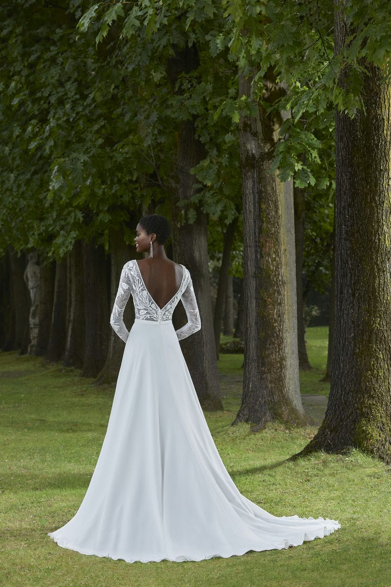 Deze prachtige jurk van Cosmobella is voorzien van bijzonder kant, een verleidelijke lage rug en een hoge loopsplit in de luxe A-lijn rok. De lange mouwen van kant maken de jurk erg klassiek.