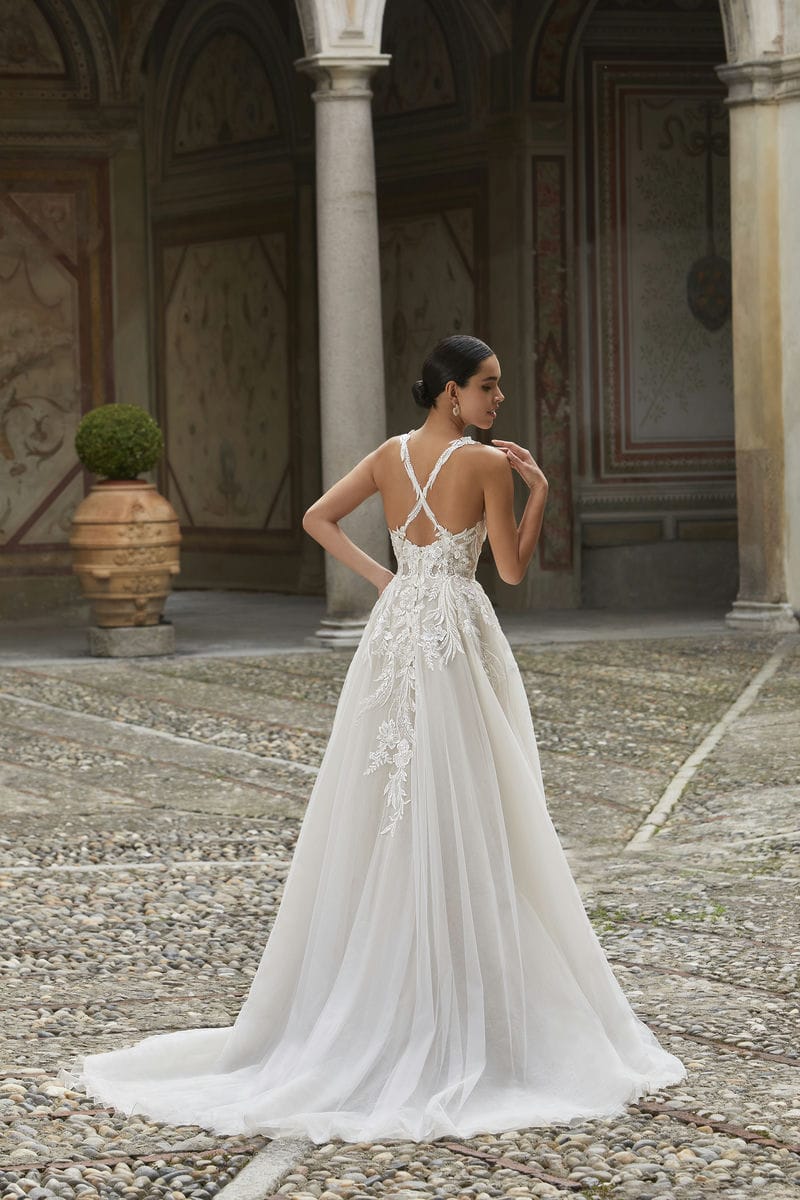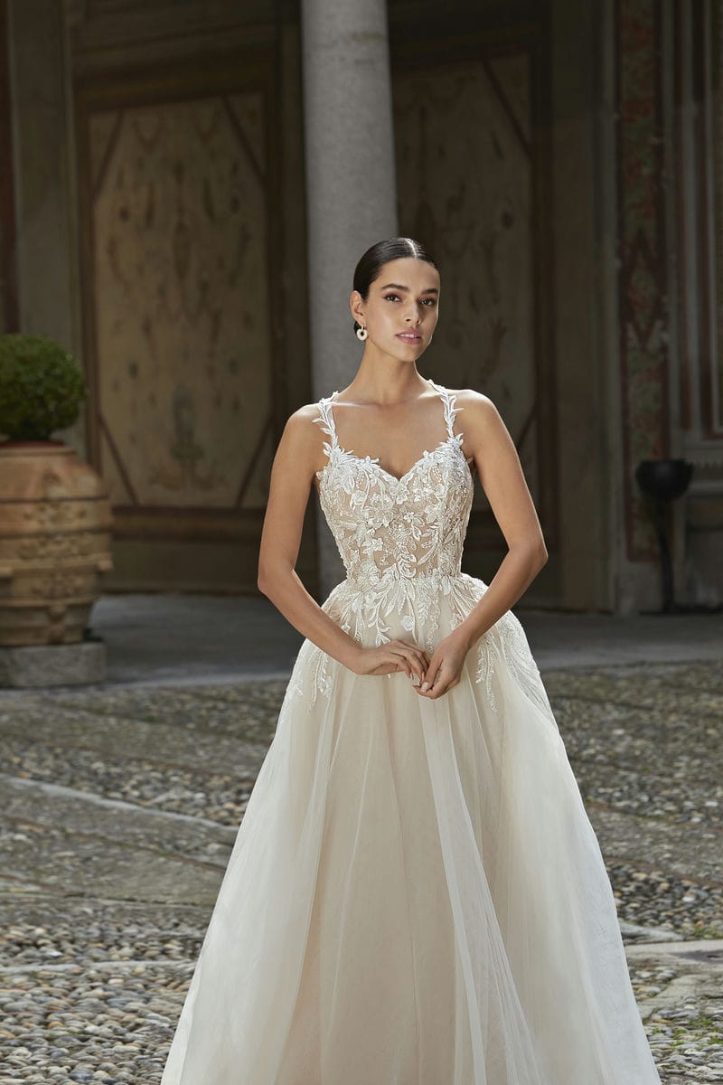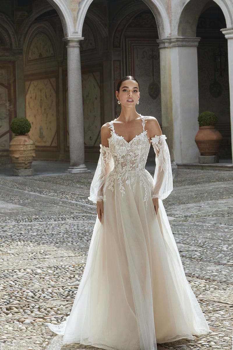 Deze trouwjurk heeft een sweetheart halslijn en schouderbandjes van kant die overlopen in kruisende bandjes op de rug. De kanten applicaties lopen prachtig over in de tule rok en de afneembare see through mouwen voegen een romantische touch toe.