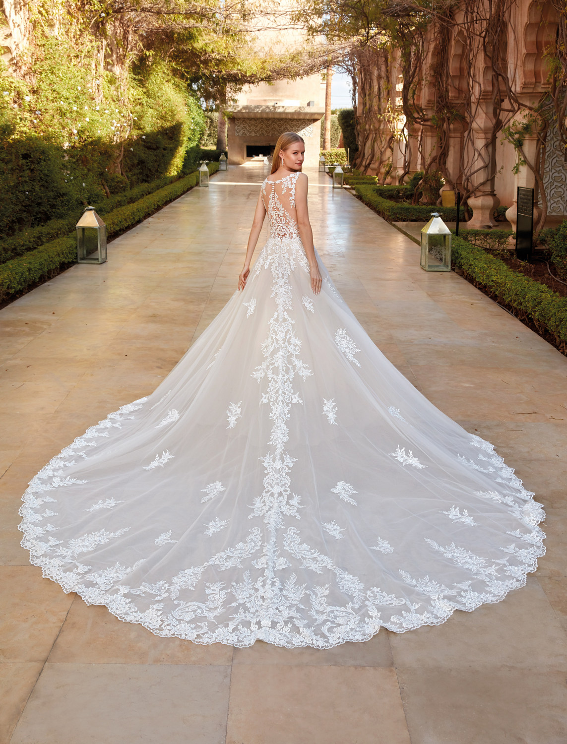 Klassiek, romantische trouwjurk van Demetrios colletie. Het illusie lijfje met kant heeft een diepeV-halslijn en kanten schouderbanden. Een apart detail zijn de illusie zijkanten van het lijfje. De illusie rug is prachtig bewerkt met kanten applicaties. De trouwjurk heeft mooie kanten applicaties op de rok en een prachtige doorschijnende kanten sleep. De rok en sleep zijn rondom afgewerkt met randkant.