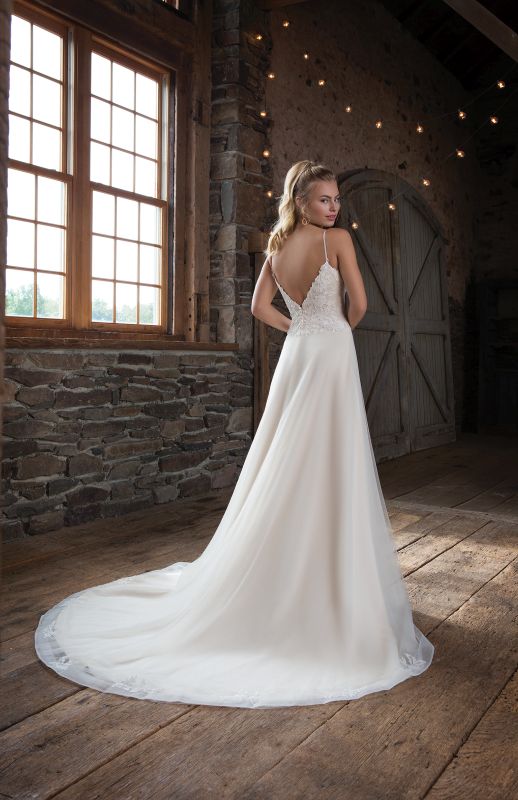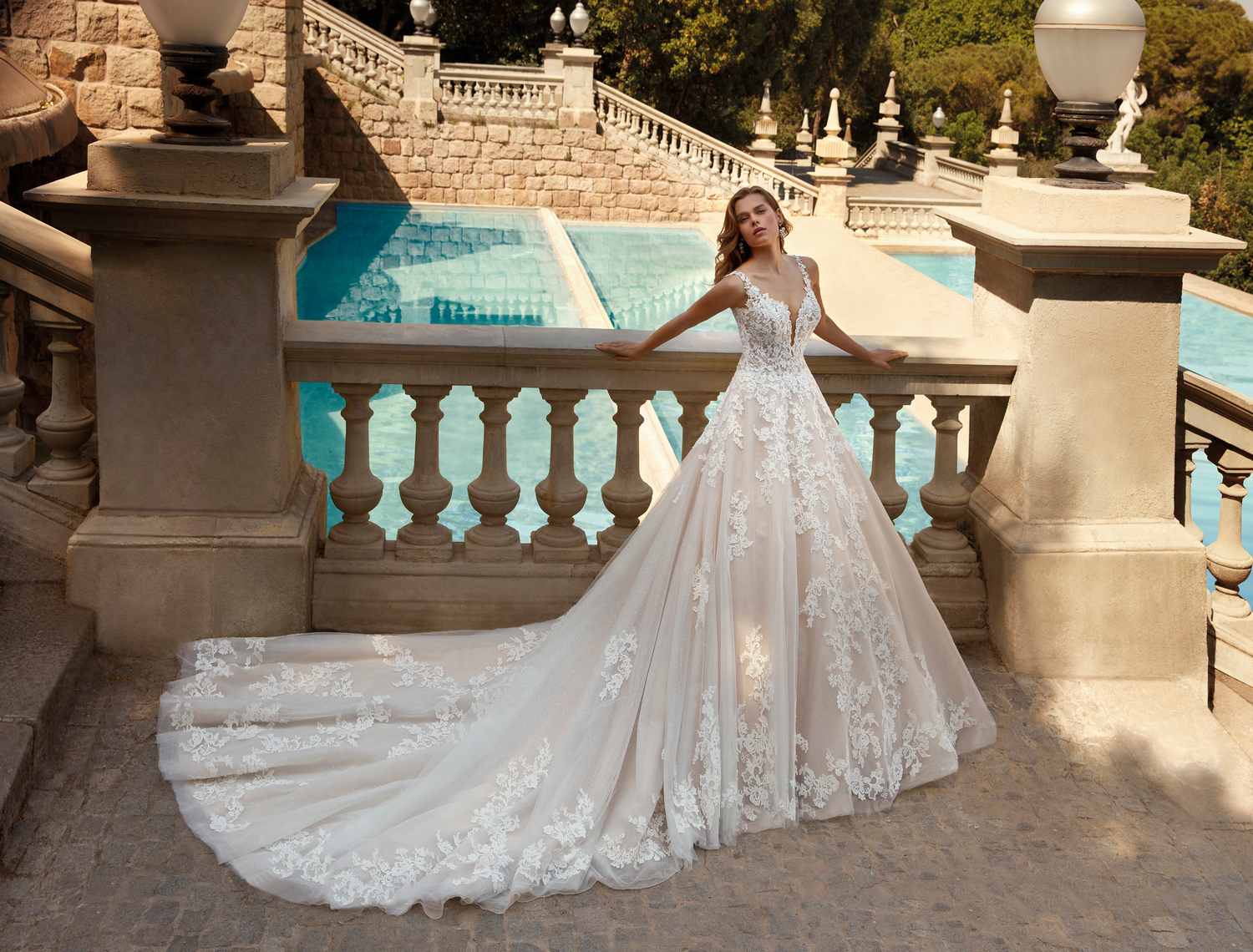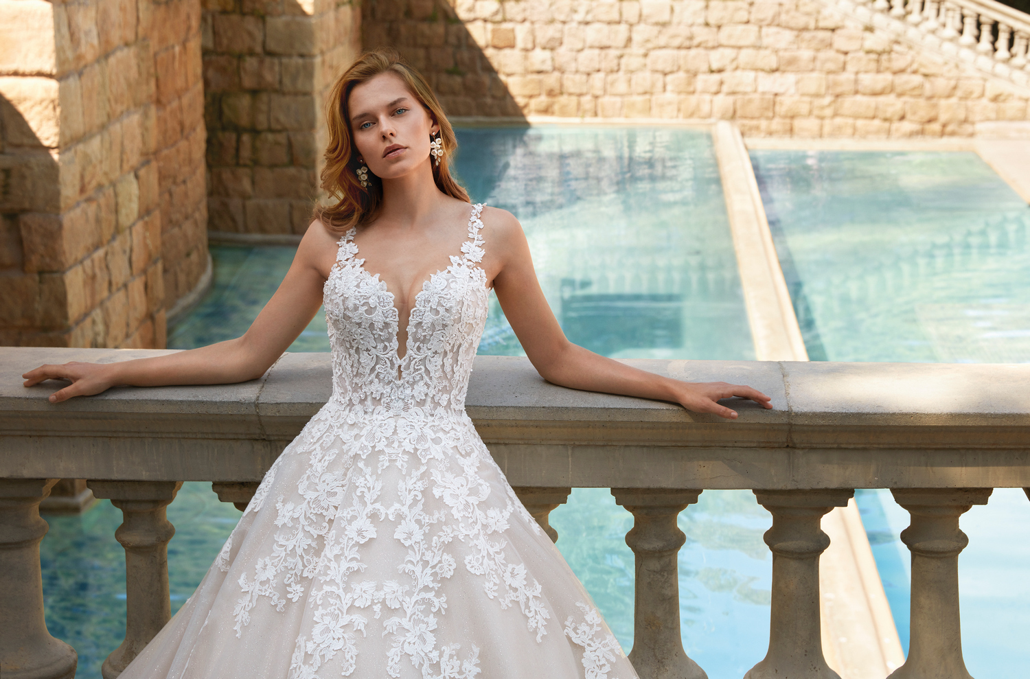 De sprankelende 1152 ball gown van Demetrios heeft een tule rok met kanten applicaties. Door de onderkleur in de rok geeft het een extra 3D effect, wat de jurk nog specialer maakt. De halslijn is diep uitgesneden, maar voorzien van een tule tussenstuk. Optionele doorschijnende lange mouwen geven een romantische look.