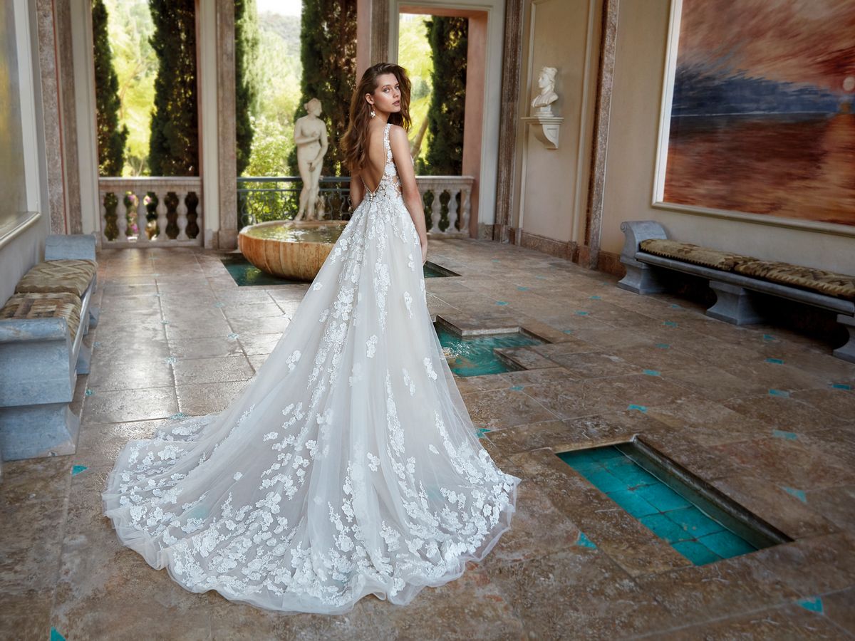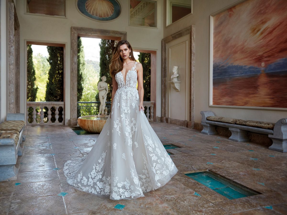 Je voelt je gegarandeerd een klassieke en romantische beauty in deze geweldige jurk van Demetrios! De lage v-hals is sexy samen met de illusie schouderbandjes. De lage rug is vrouwelijk en de sleep is op de juiste plaatsen bedekt met de mooiste kanten applicaties. Perfect voor jouw bruiloft in een kasteel of prachtige tuin.