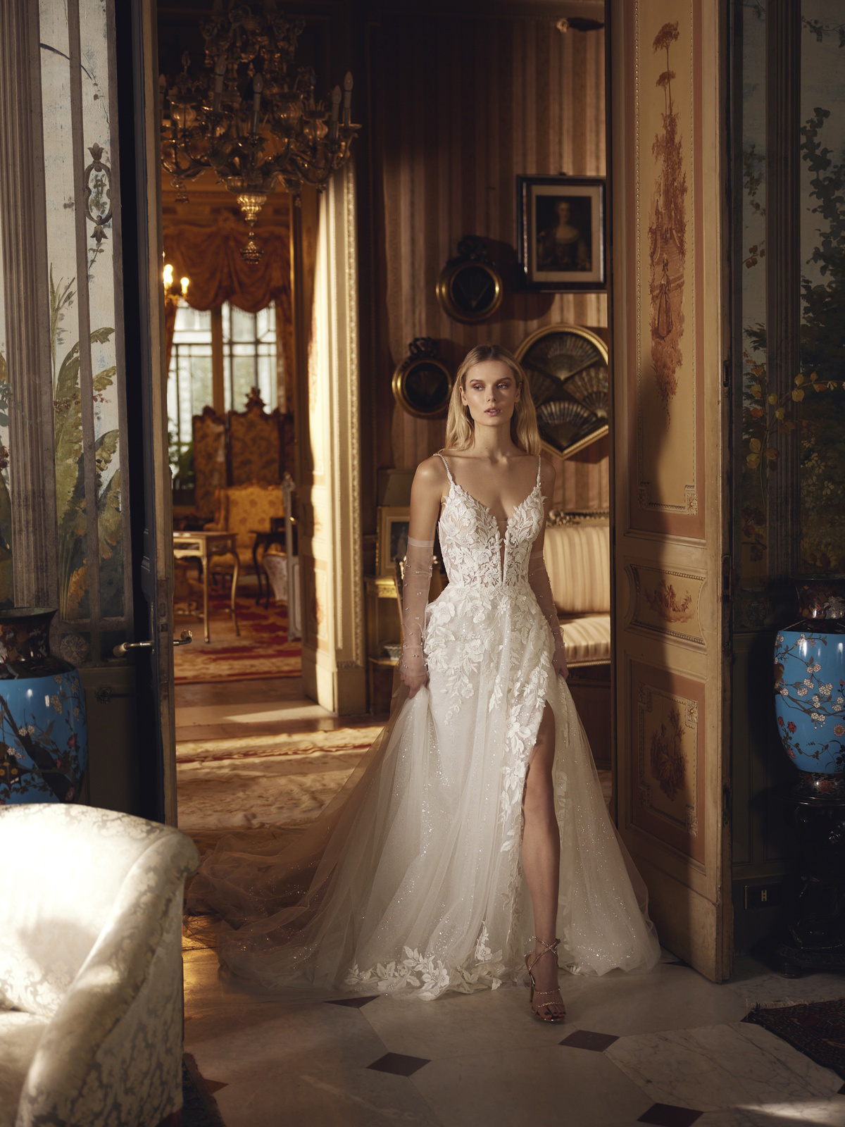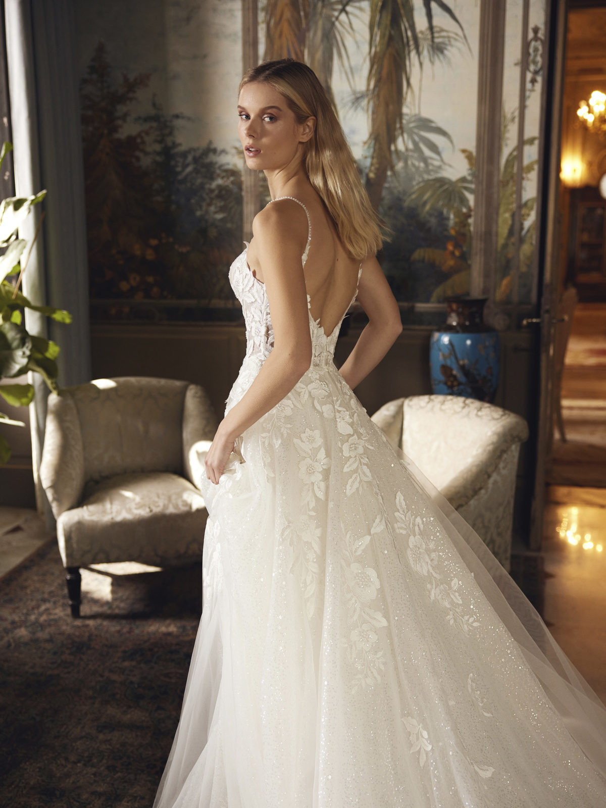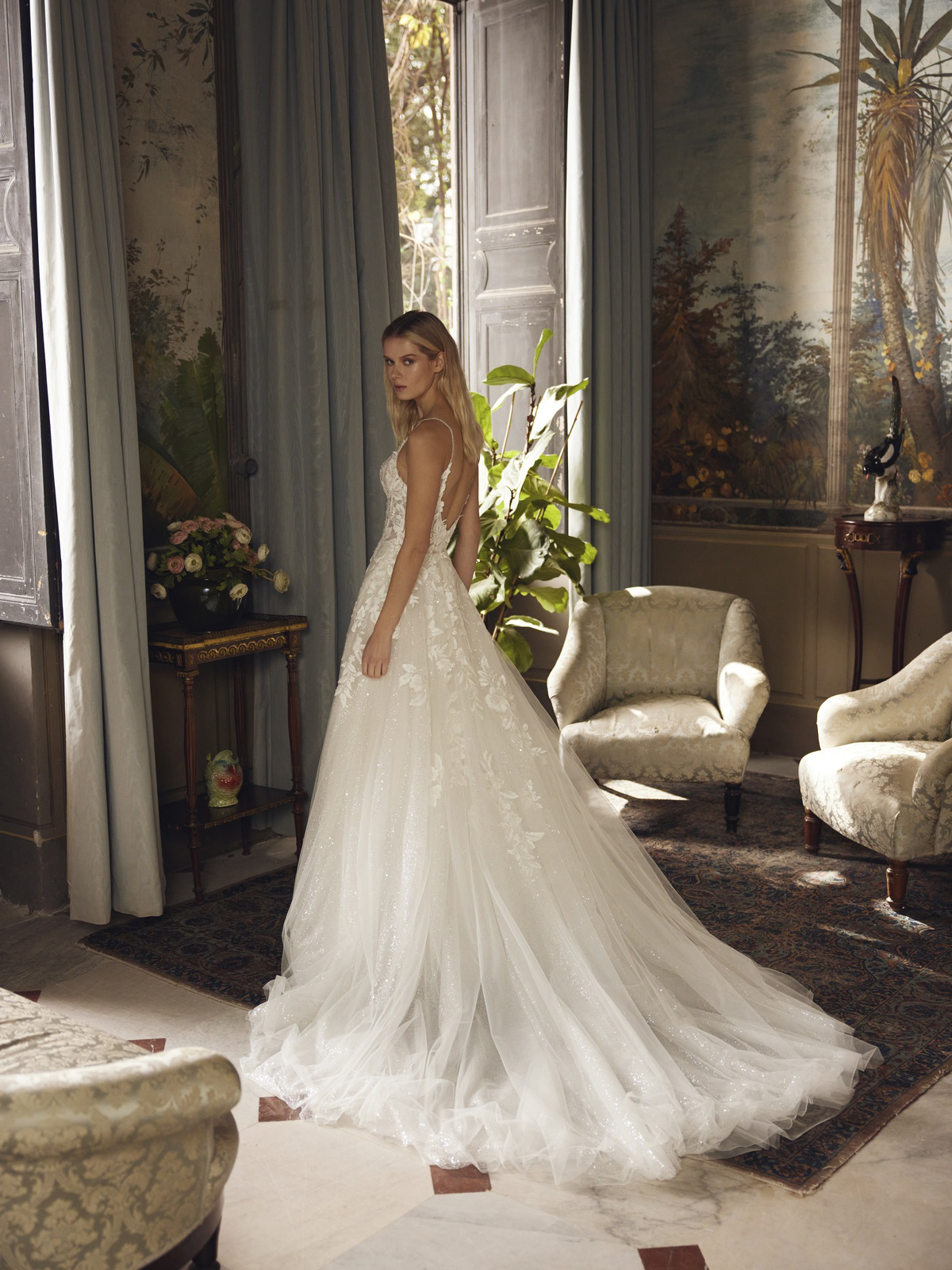 Licht, weelderig en sensueel, stijl 1293 is een droomjurk met fijne spaghetti bandjes, een verleidelijk korset en diep uitgesneden lijfje. Het weelderige kant over de zachte tule rok voegt een vleugje luxe charme toe aan deze prachtige jurk.
