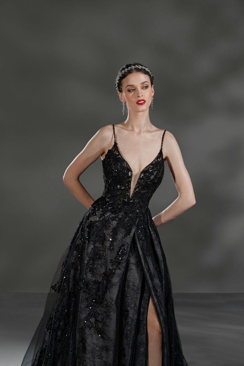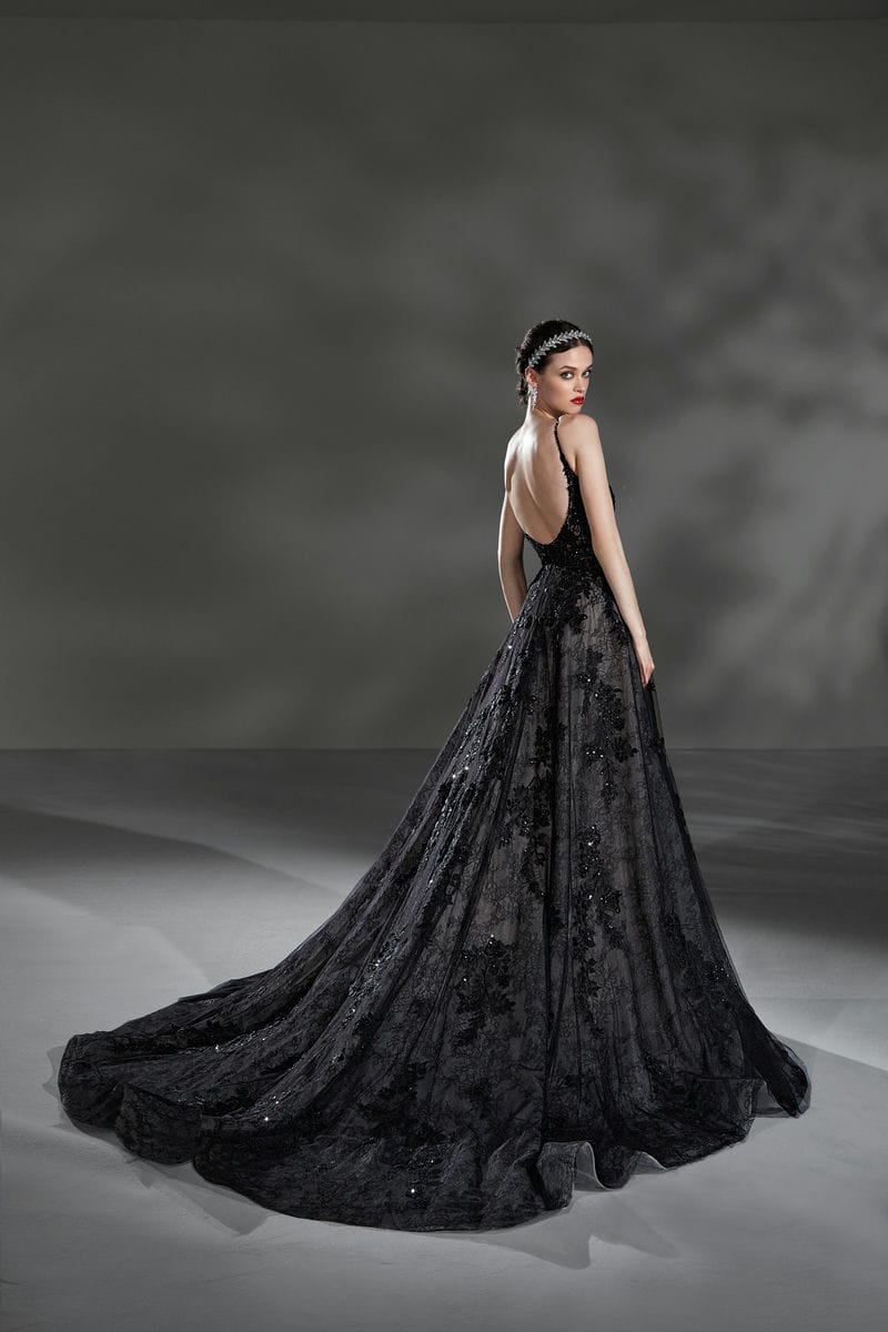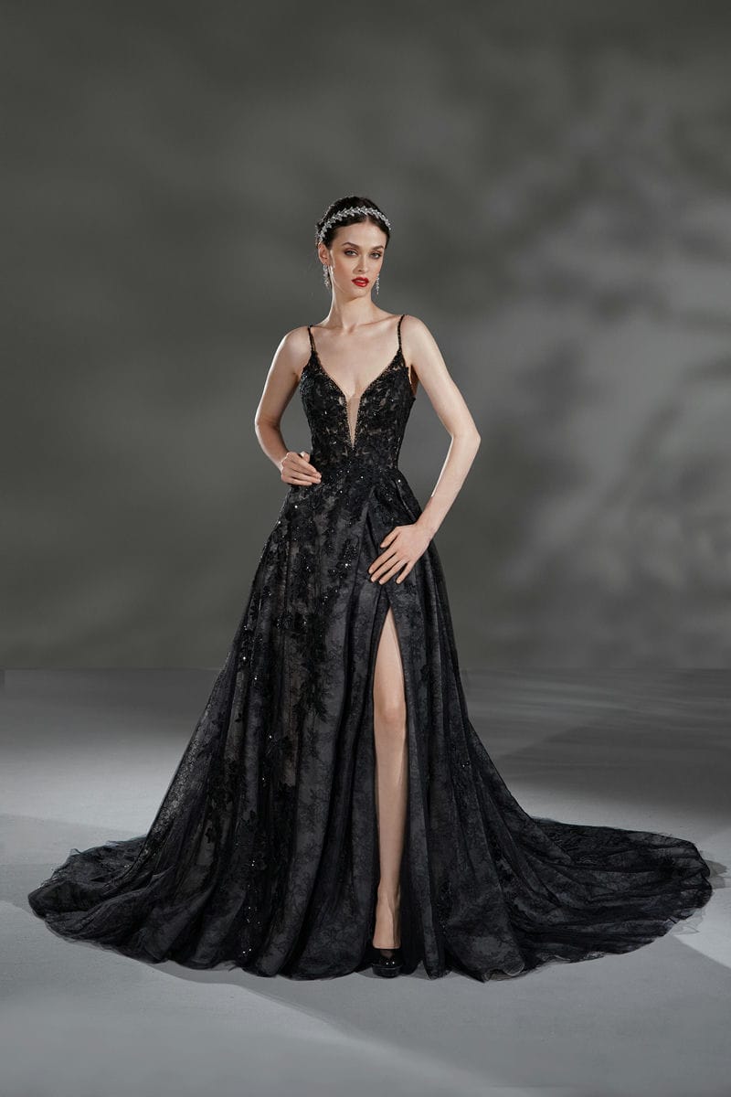 Deze jurk is perfect voor de bruid die er echt uit wil springen op haar trouwdag! Deze zwarte trouwjurk uit de Alta Moda lijn van Demetrios is een A-lijn model met een aansluitend lijfje dat je figuur prachtig flatteert. De kanten applicaties hebben een mooie glinstering en versieren de hele jurk. De sexy loopsplit maakt deze jurk helemaal af!