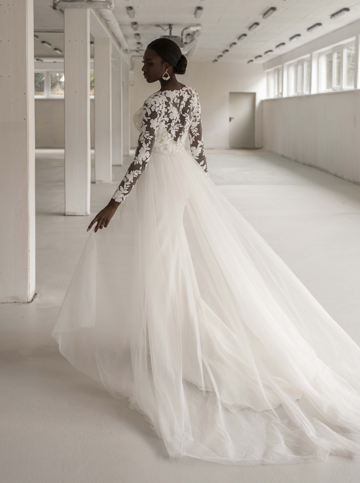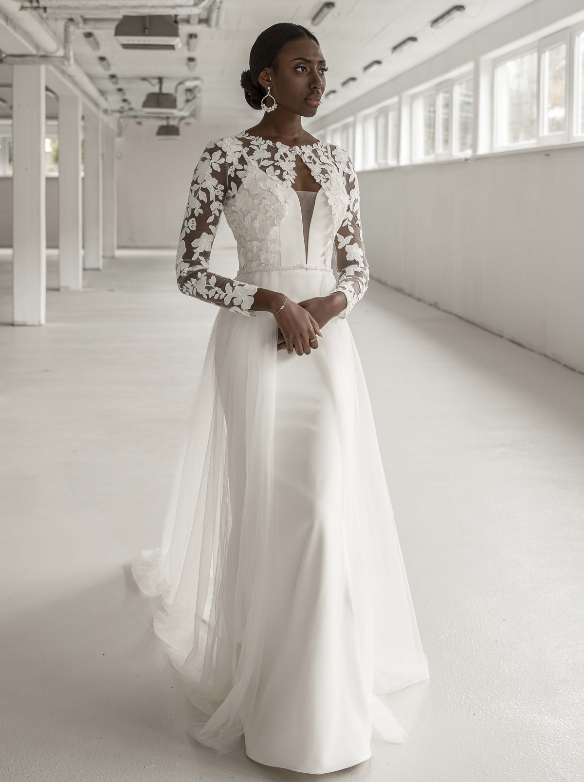 Een prachtige en stijlvolle fishtail jurk die in één woord tijdloos is. Deze jurk met een mooie V-halslijn biedt de optie van kanten mouwen, wat zorgt voor een romantische touch. Een jurk waar we verliefd op zijn vanwege zijn tijdloze elegantie.Deze jurk heeft een losse overjas.