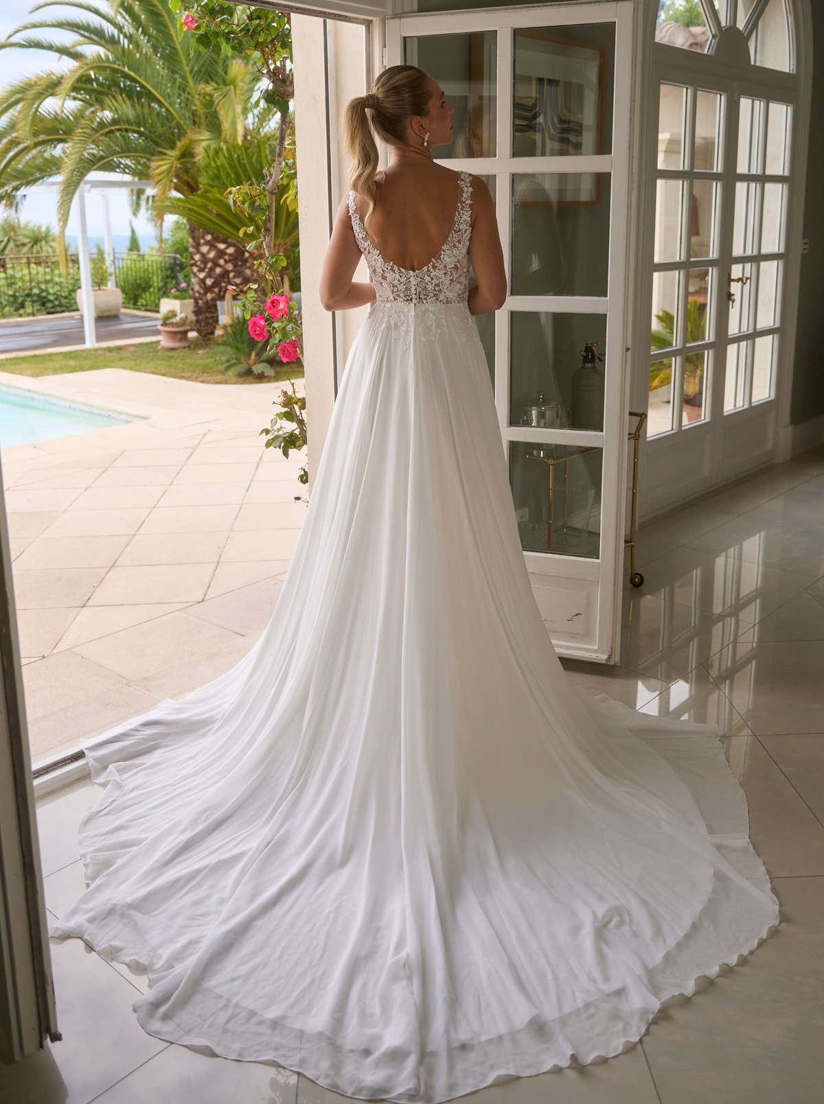 Deze mooie trouwjurk straalt tijdloze romantiek uit. Het V-hals lijfje, versierd met prachtige 3D bloemen applicaties, straalt een etherische charme en elegantie uit. De open rug en getailleerde taille voegen een speelse touch toe aan het klassieke silhouet van de jurk. De lichtgewicht chiffon rok met loopsplit biedt een moderne uitstraling. Ook voor een curvy girl een perfect match.