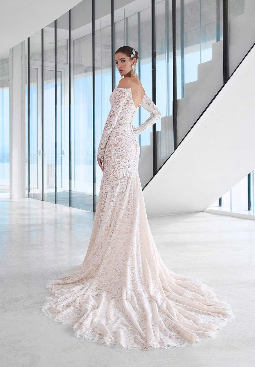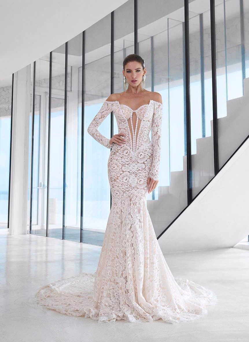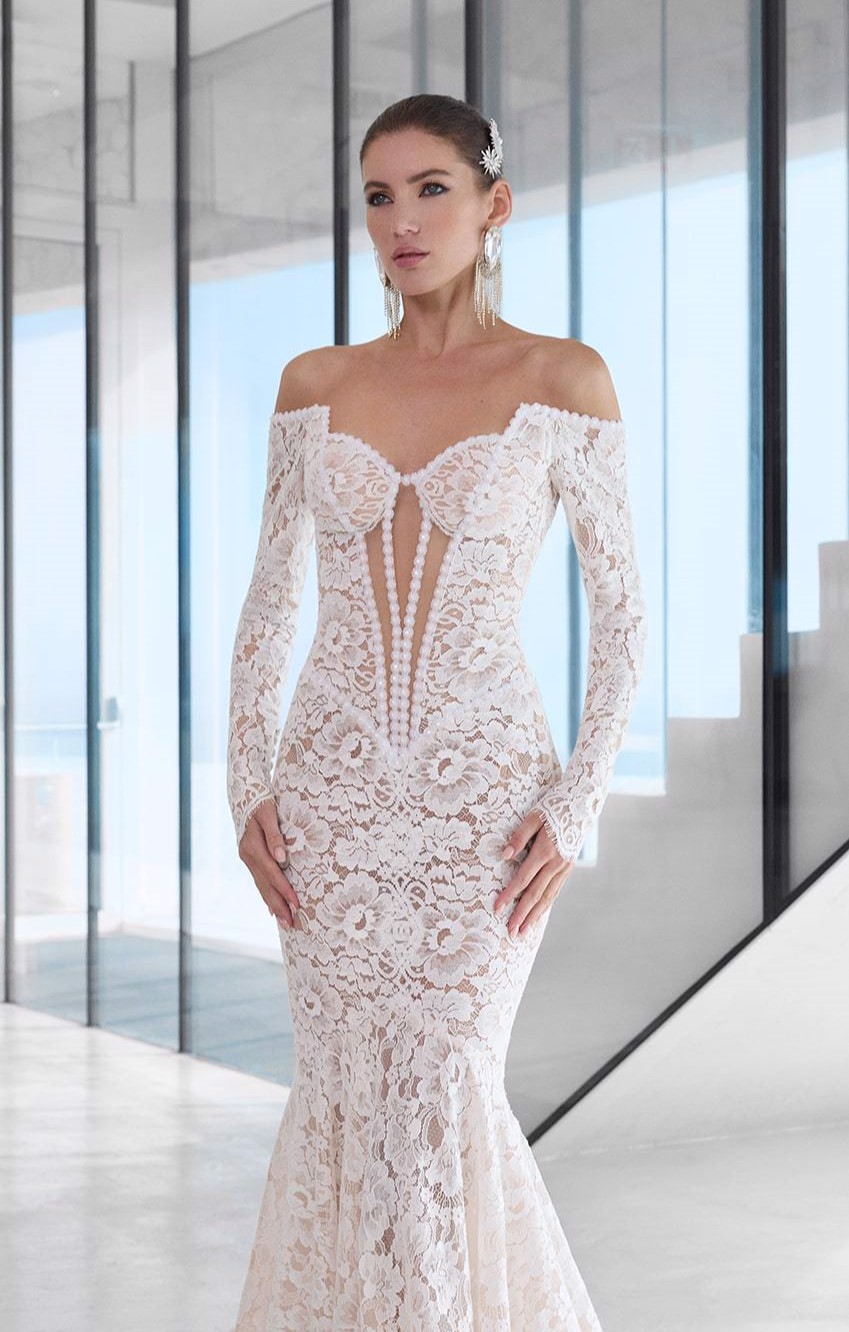 Maak een onvergetelijke indruk met de spectaculaire Baroness trouwjurk van het exclusieve merk Galia Lahav. Deze aangesloten, adembenemende creatie van Frans kant heeft elegante off-shoulder mouwen en een sexy see-through ontwerp. De grote pareldetails bevatten glitter, waardoor deze glitteren wanneer je beweegt. De basque taille accentueert de vrouwelijke vormen, terwijl de sleep een dramatische touch toevoegt. Een absolute droomjurk voor de bruid die pure glamour en stijl wil uitstralen op haar grote dag.