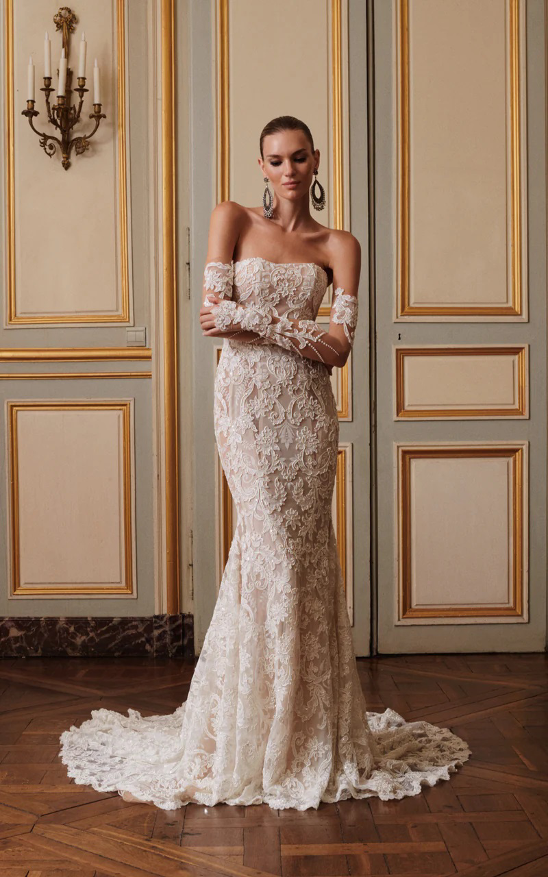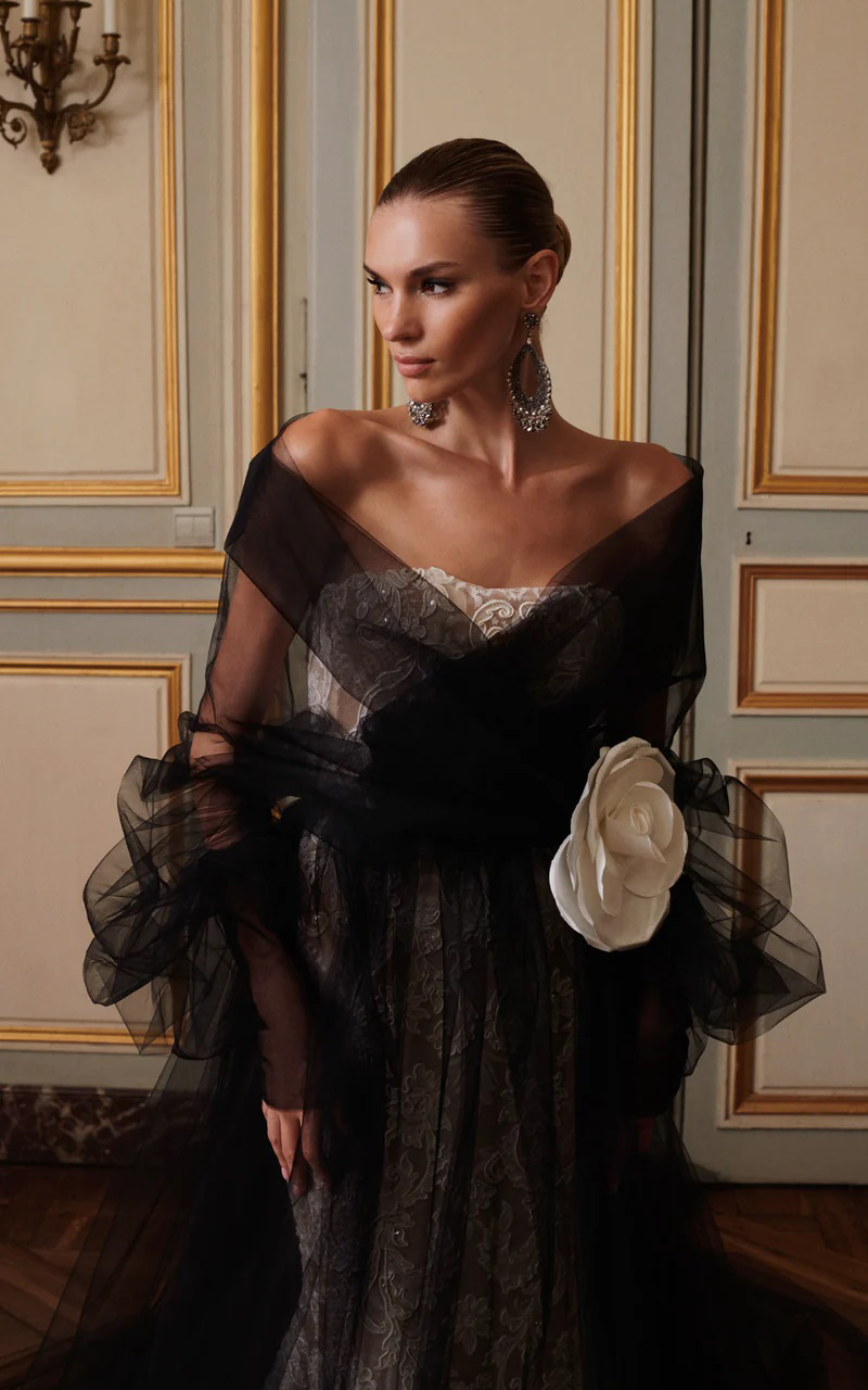 Bijou is een Couture ontwerp van het luxe merk Galia Lahav. De fit & flare kanten trouwjurk is te bestellen met bijpassende mouwen en een zwarte, haute couture, off-shoulder, opera coat. Available during trunkshow