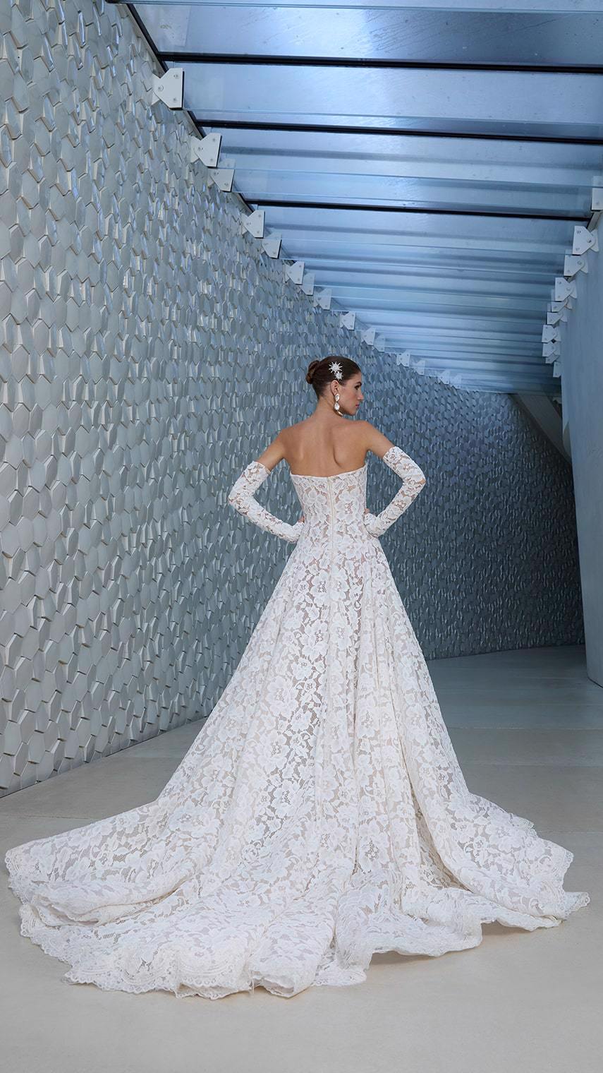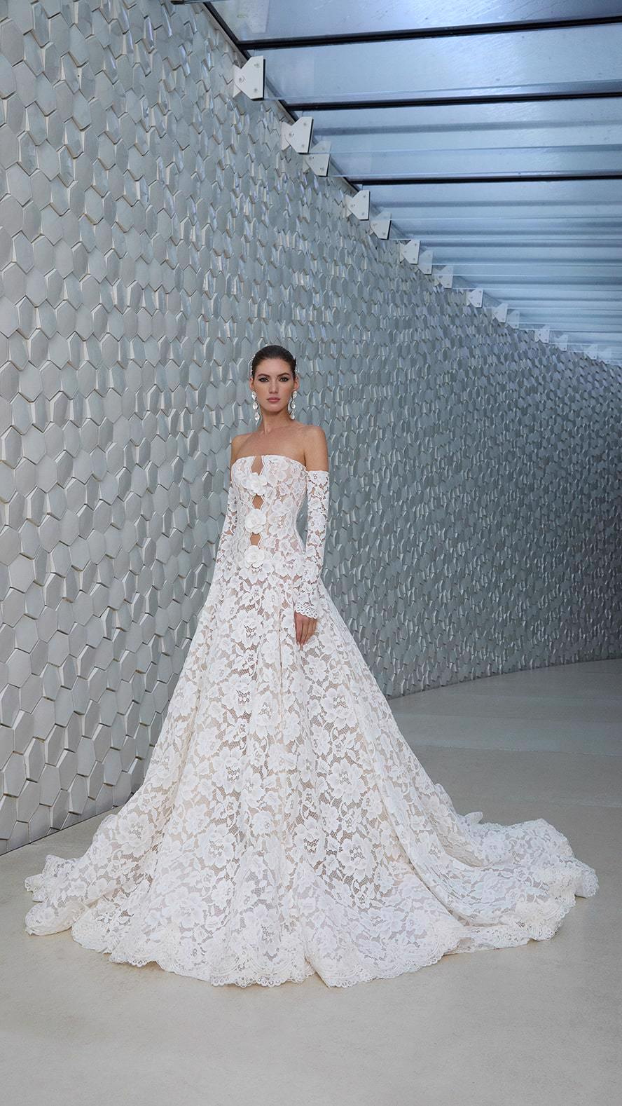 De Contessa trouwjurk van het exclusieve merk Galia Lahav is een verfijnd en chique ontwerp uit de Couture-lijn. Het strapless lijfje en lage taille gecombineerd met het princess silhouet maken van de Contessa een romantische verschijning. Gemaakt van grof Frans kant en versierd met handgemaakte zijden bloemen, straalt de jurk moderne luxe en elegantie uit. De see-through details voegen een sexy en verfijnde touch toe. De optionele bijpassende mouwen maakt deze vrouwelijke look helemaal af. Voor de bruid die houdt van elegantie, couture, verfijning en vrouwelijk.