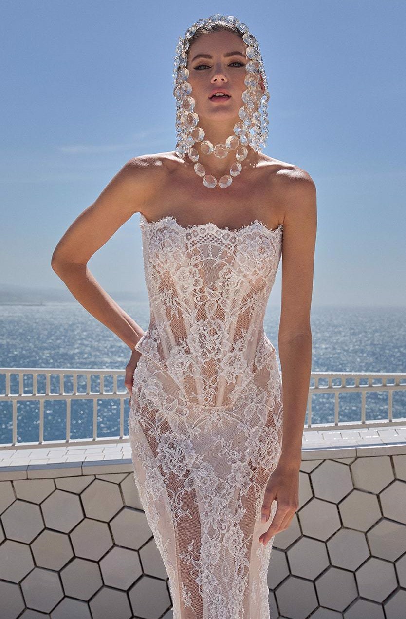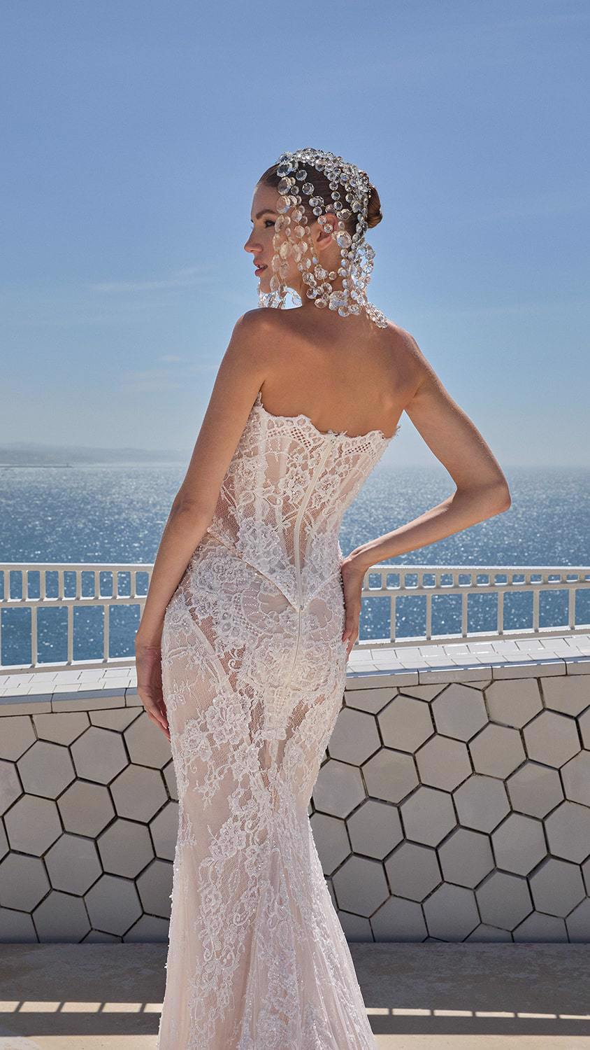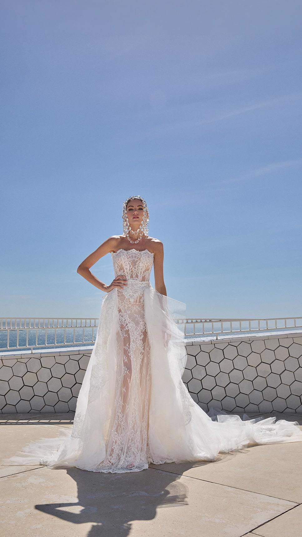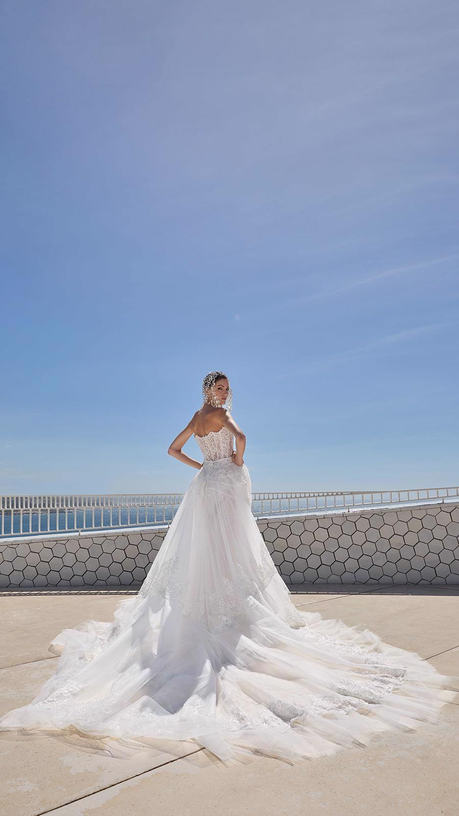 De Evangeline trouwjurk van het exclusieve merk Galia Lahav is een echte eyecatcher uit de prestigieuze Couture-lijn Suivez-Moi. Deze strapless tweedelige creatie combineert een barok korset met een aangesloten sexy rok, beide gemaakt van luxueus geborduurd Frans kant en see-through lijnen. Wil jij 2 looks in 1? Bij de Evangeline kan optioneel een bijpassende overskirt met een prachtige sleep bij. Zo kan je van een aangesloten, sexy trouwjurk naar een grootse, romantische look en andersom. Perfect voor de bruid die luxe couture wil combineren met een indrukwekkende bruidslook.