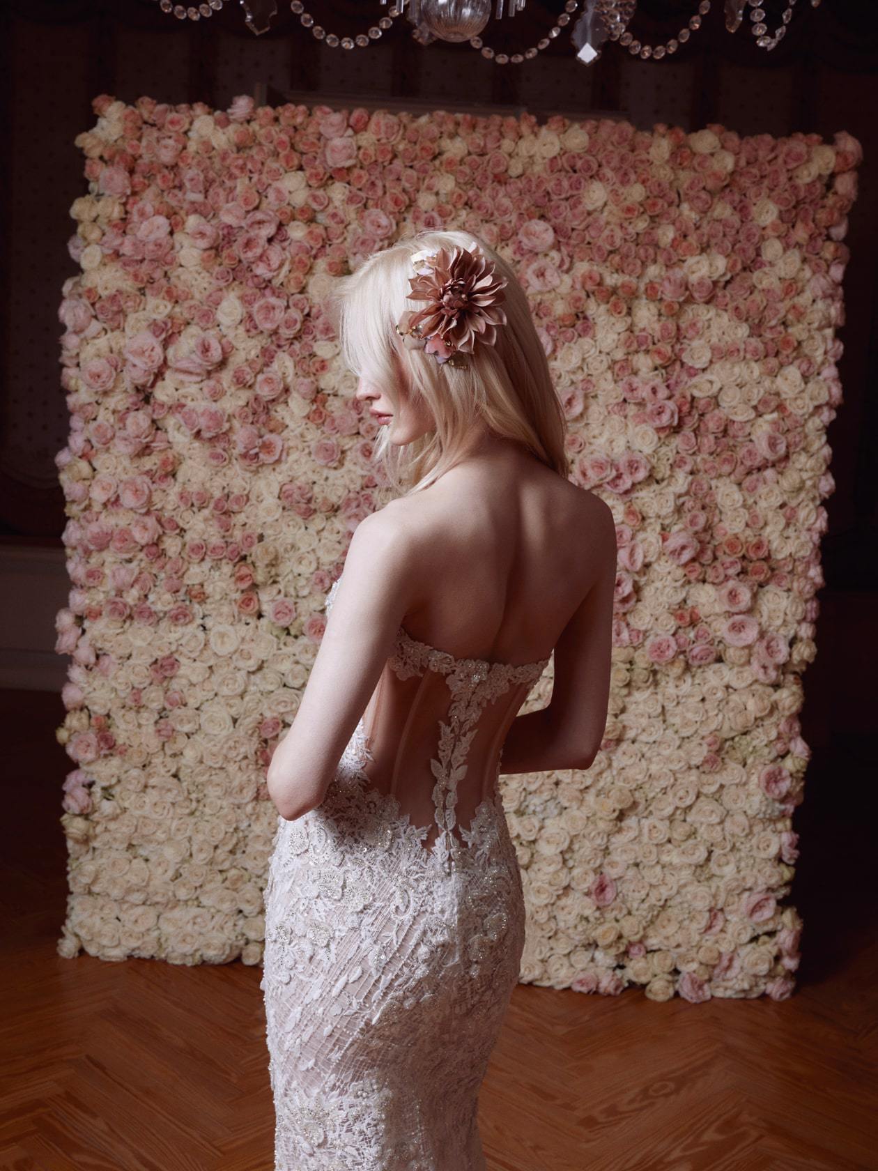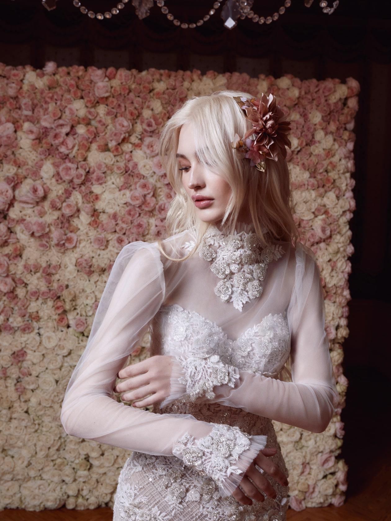 De Mojo van het hoogwaardige merk Galia Lahav is te bestellen met bijpassende bolero. Hiermee heb je een extra look met een hoge hals en mouwen. Delicaat en toch luchtig. Available during trunkshow