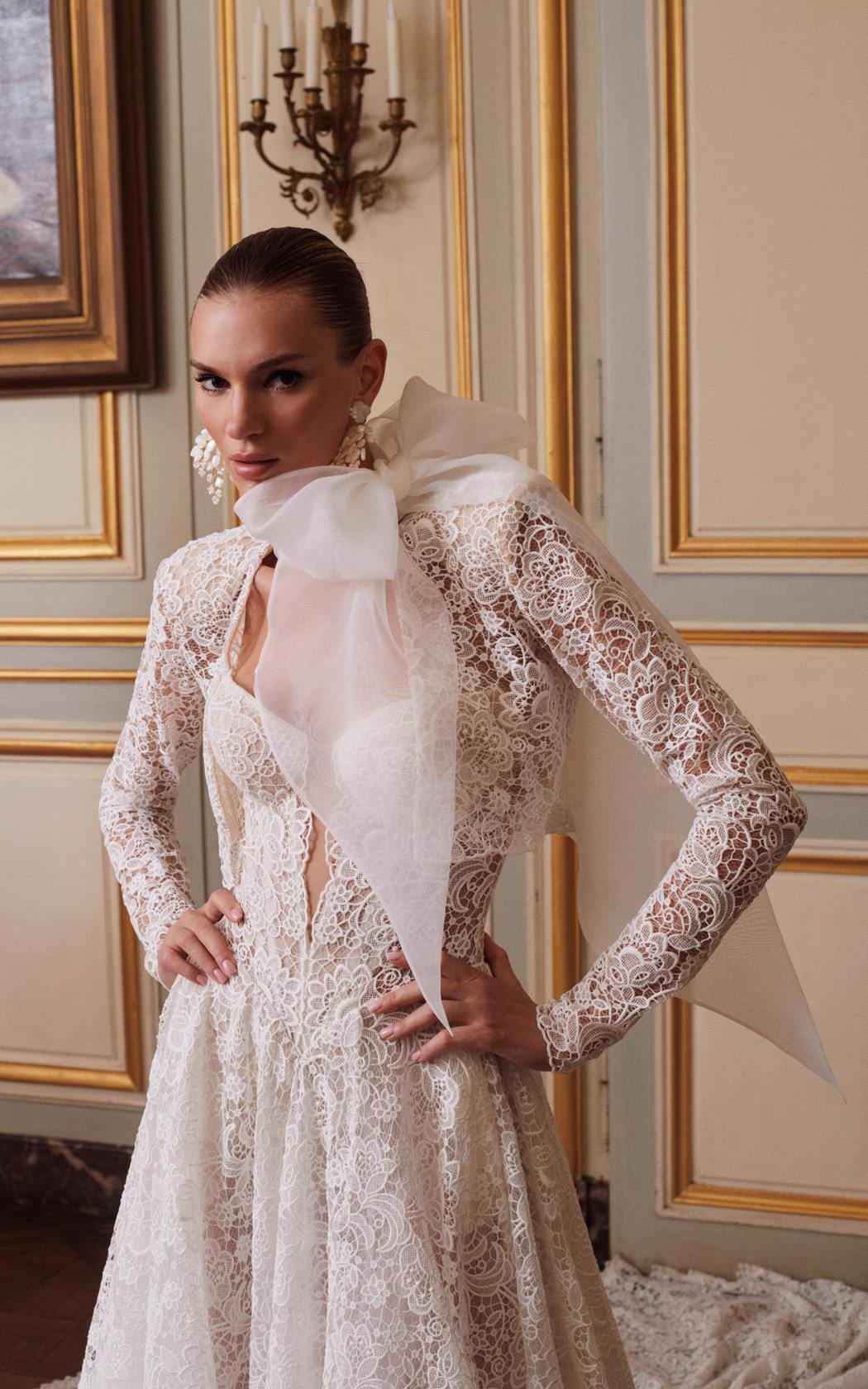 De Opéra trouwjurk van Galia Lahav is een adembenemend couture ontwerp dat tijdloze klasse uitstraalt. De strapless A-lijn stijl, gemaakt van verfijnd Frans kant, vormt een romantisch silhouet met subtiele see-through details. Met de optionele kanten bolero met elegante mouwen voeg je extra verfijning toe aan je look. De indrukwekkende kathedraal-sleep maakt deze jurk perfect voor een grootse en onvergetelijke bruiloft. Opéra is de perfecte keuze voor de bruid die een tijdloze en luxe uitstraling zoekt. Available during trunkshow