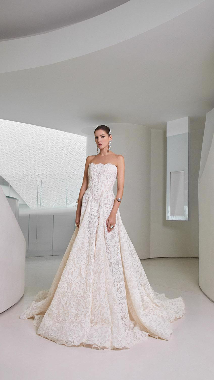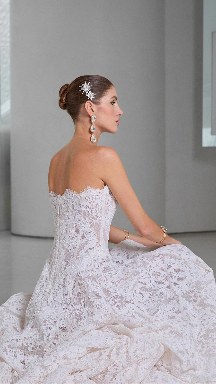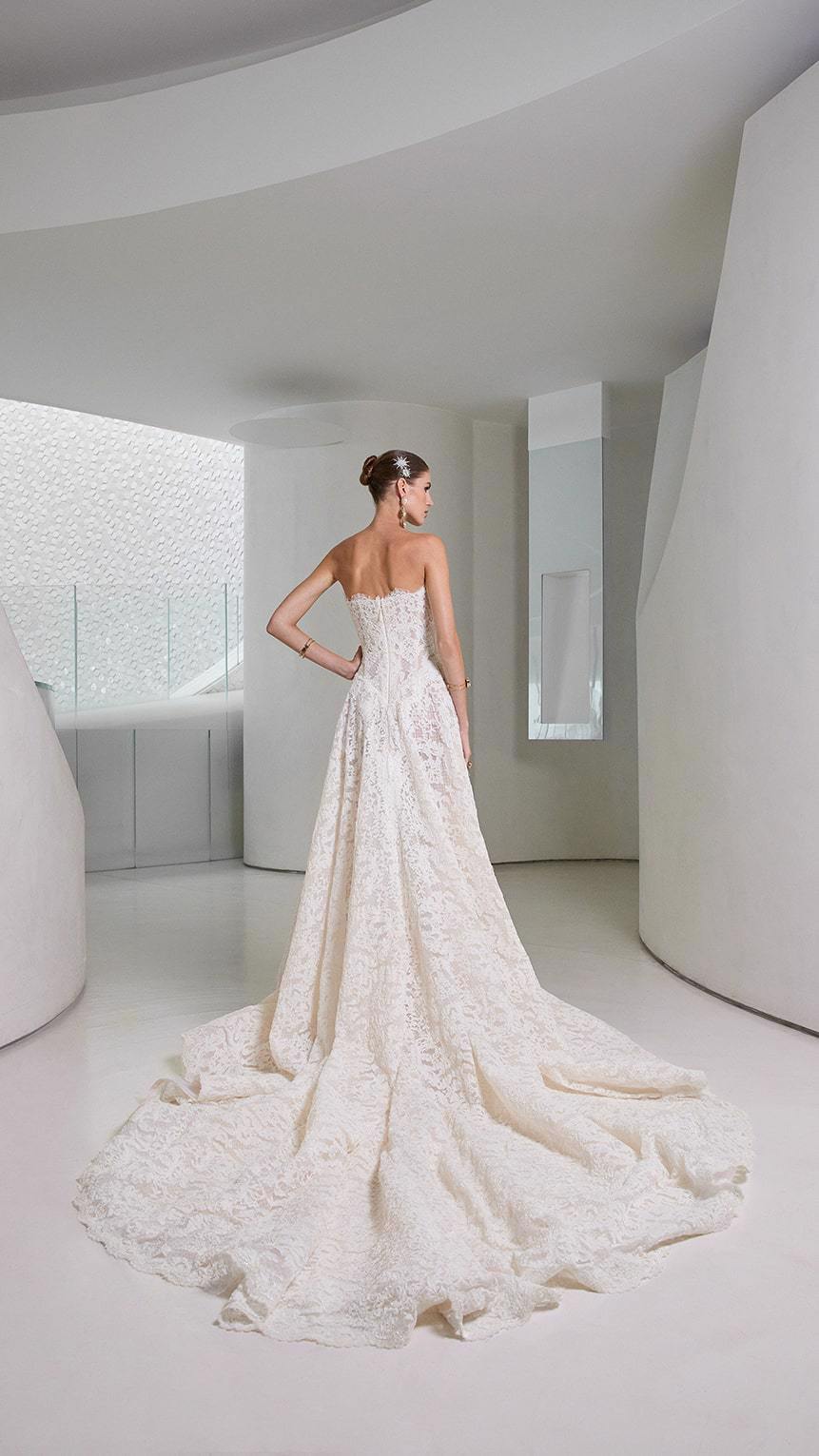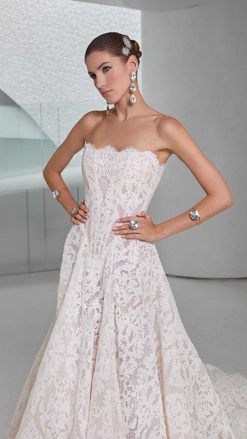 De Splendid trouwjurk van het exclusieve merk Galia Lahav straalt tijdloze elegantie uit. Deze strapless A-lijn jurk is gemaakt van verfijnd Frans kant en heeft een prachtig korset lijfje met een basque taille die de vrouwelijke vormen benadrukt. Deze romantische trouwjurk is zeer verfijnd afgewerkt en de grote sleep maakt deze trouwjurk helemaal af. Perfect voor de bruid die zoekt naar een stijlvolle en unieke look.